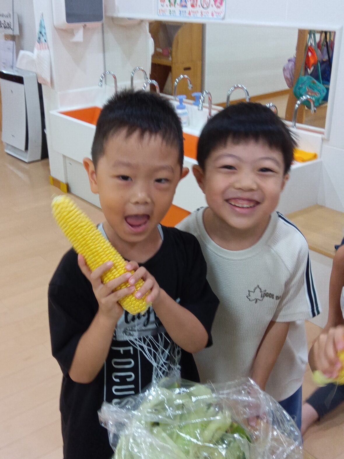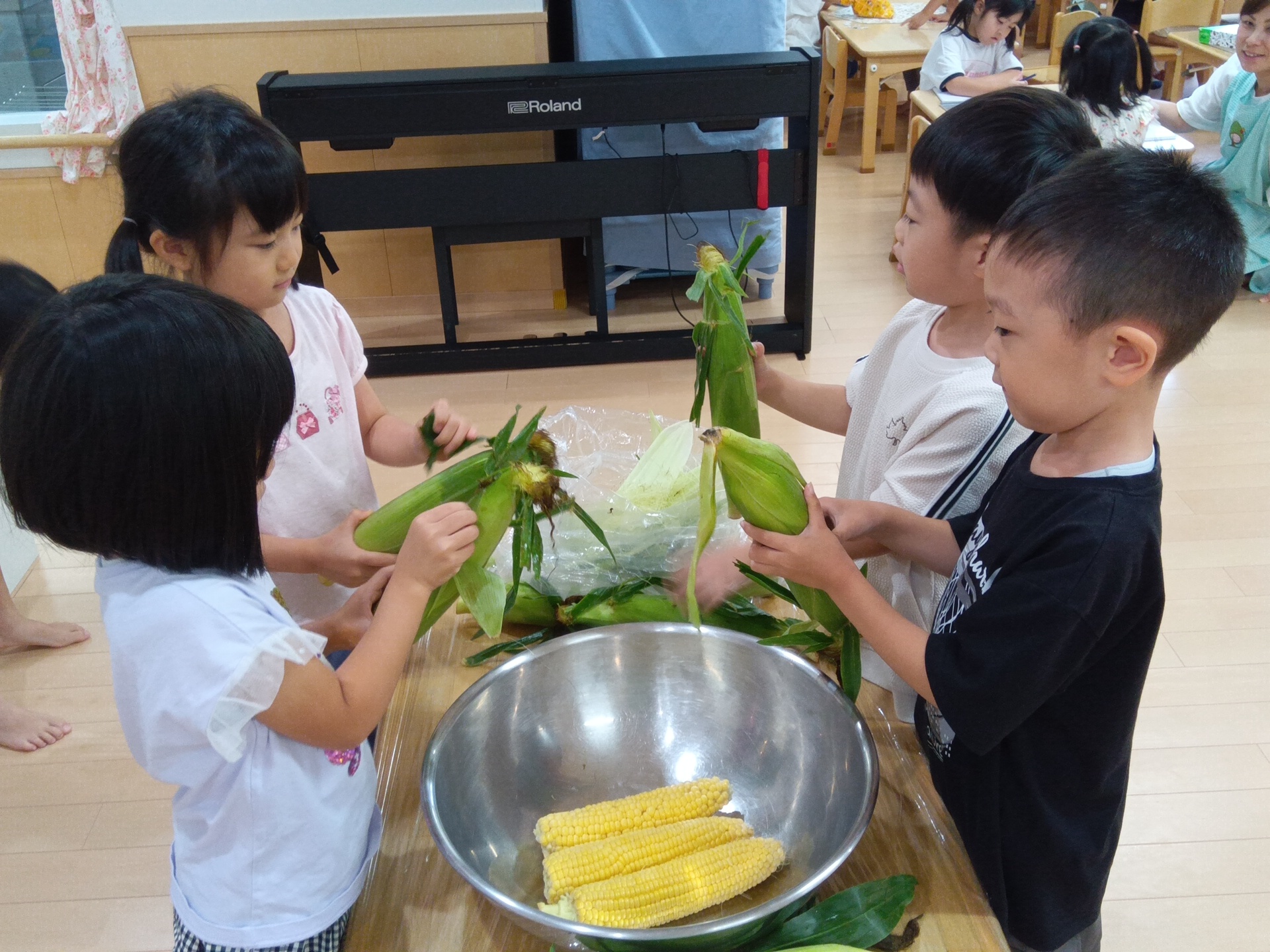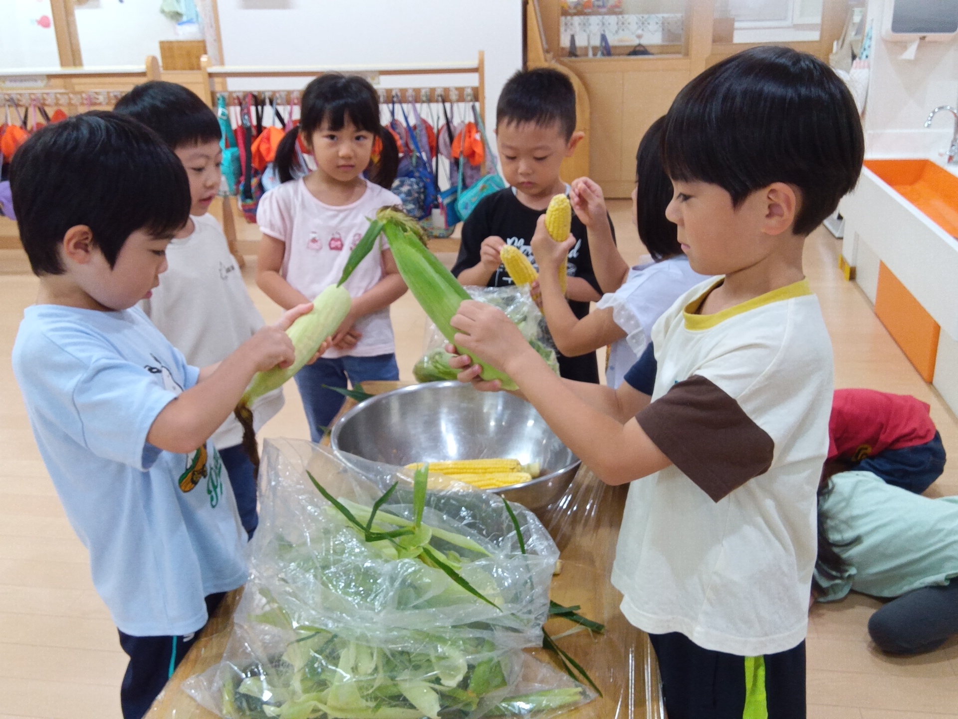 とうもろこしの皮むきに任命されたのは年長クラスの子どもたち。