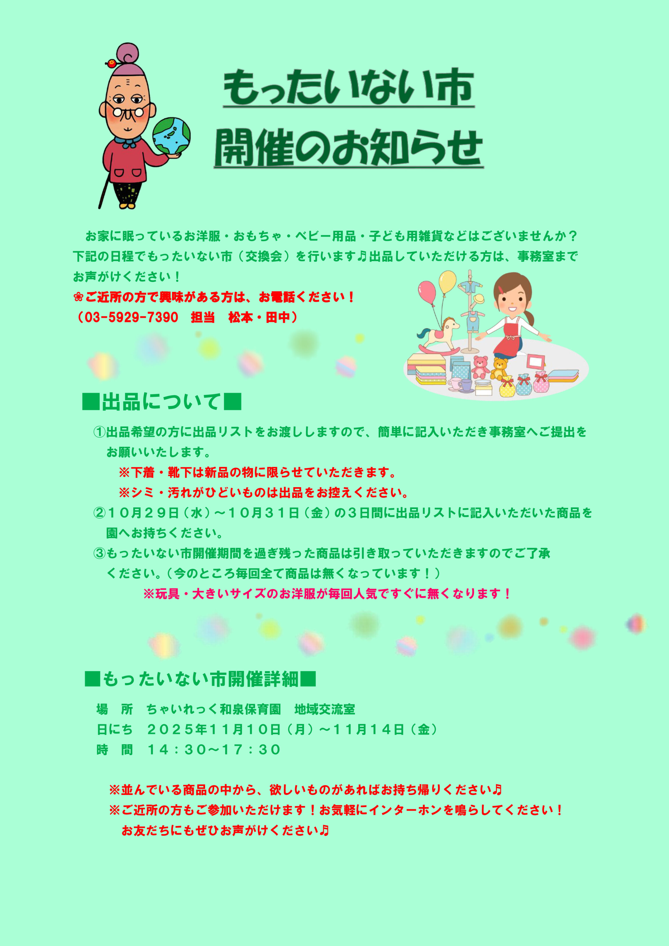 いつもみなさまのおかげでお洋服やおもちゃなど、たくさんの品物が並びます。毎度大盛況のもったいない市、ぜひお気軽にお越しください♪