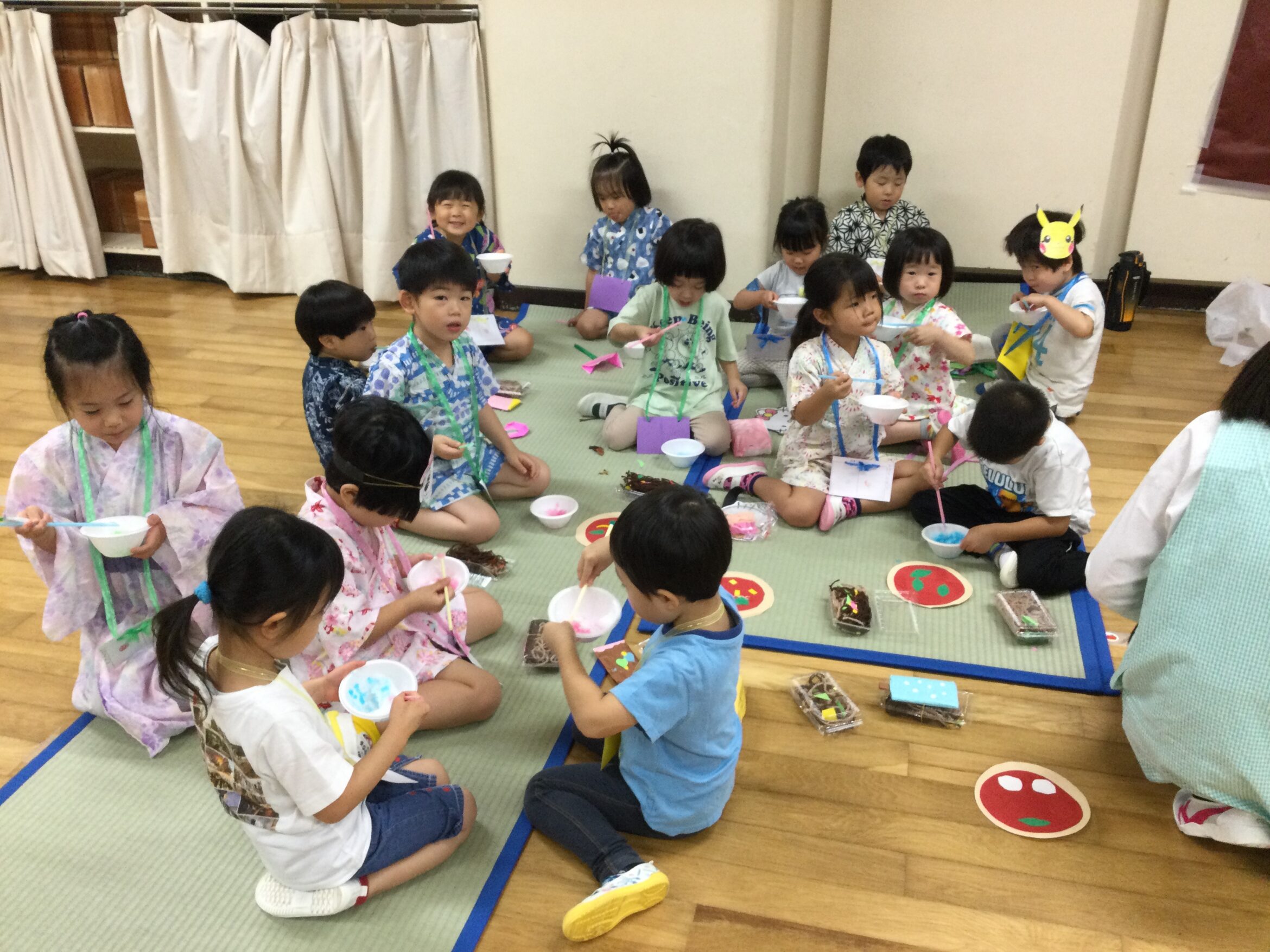 お祭りと言えばかき氷!好きなシロップを選んでみんなで食べました…♪