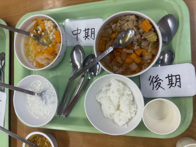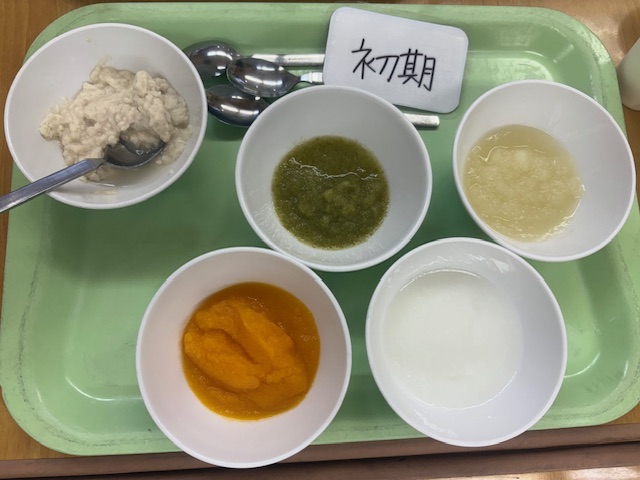 園の栄養士から離乳食のすすめ方をお話しし、実際に初期・中期・後期の離乳食の大きさや形を見て試食をしました。
