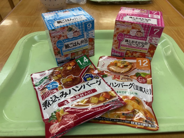 また、市販のベビーフードの試食もしました。日々忙しい保護者の方が、気負わずに離乳食を進めていくにあたり、欠かせないものとなっています。また、お出かけの際には手作りのものより衛生的にも安心です。年齢によってどの程度、味付けや大きさが違うのか、大人も食べてみることで知ることができました。