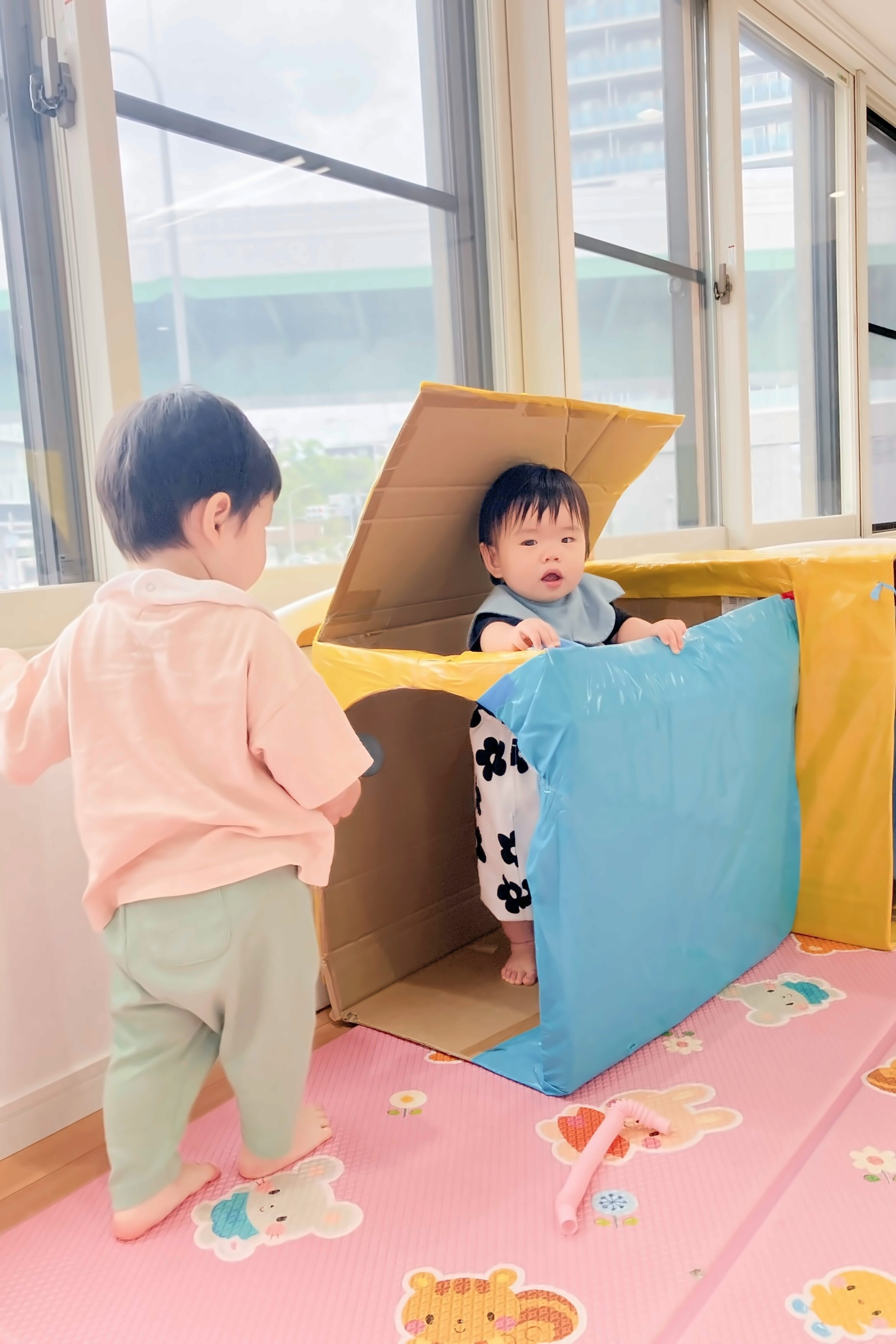 外から覗いても中から出てきても楽しい手作りダンボールハウス♪