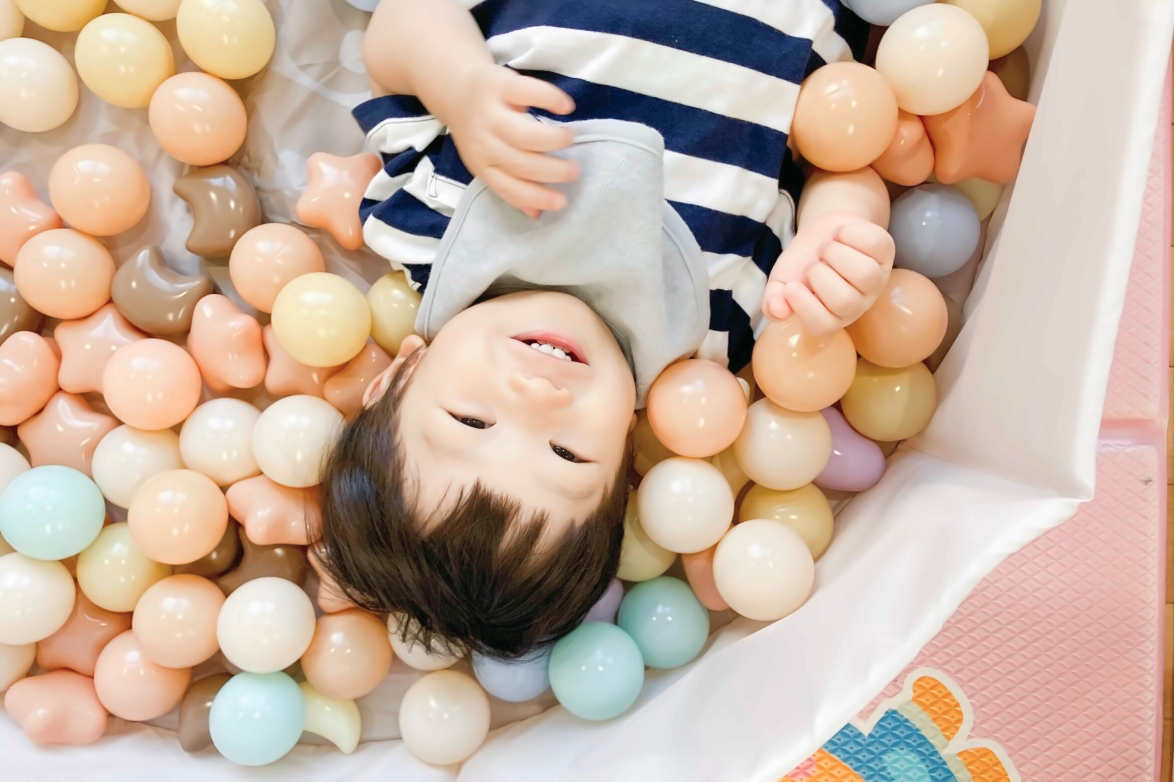 ママが迎えに来てもニコニコ笑顔で「ボールプール楽しいよ♪」とアピール中