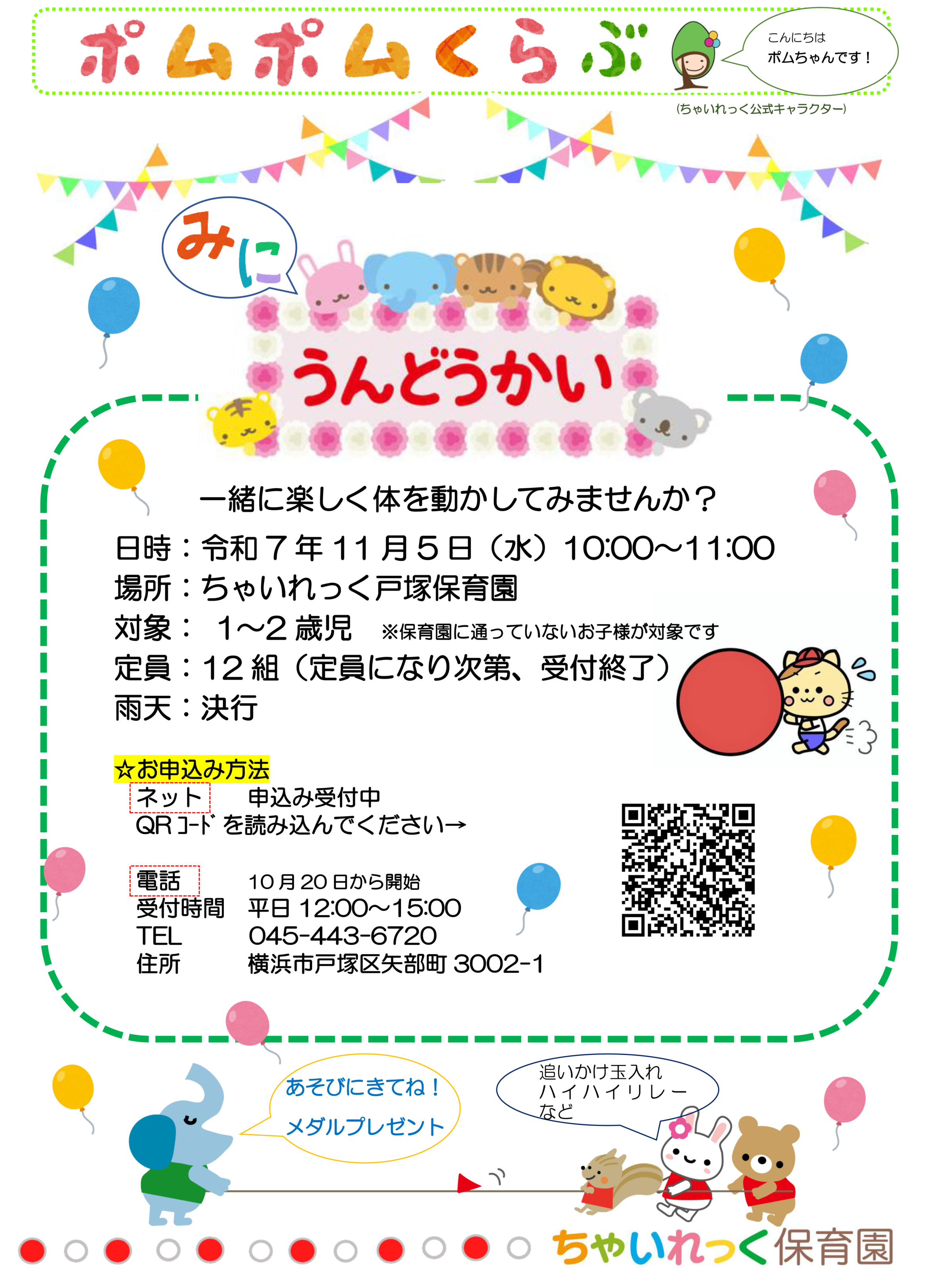 2025.10.24 戸塚保育園 11/5(水) ミニ運動会のお知らせ \ 1歳児~2歳児の未就学児のお友だちを大募集 /ちゃいれっく戸塚保育園でミニ運動会を開催します。 一緒に楽しく体を動かしてみませんか?こちらのフォームまたはお電話にてお申し込みください! ■——————————————-■日時:11/5(水) 10:00~11:00場所:ちゃいれっく戸塚保育園対象:1歳児~2歳児の未就学児の方定員:12組(定員になり次第、受付終了) ★残りわずかです★雨天:決行■——————————————-■ みなさまのご参加、お待ちしています!