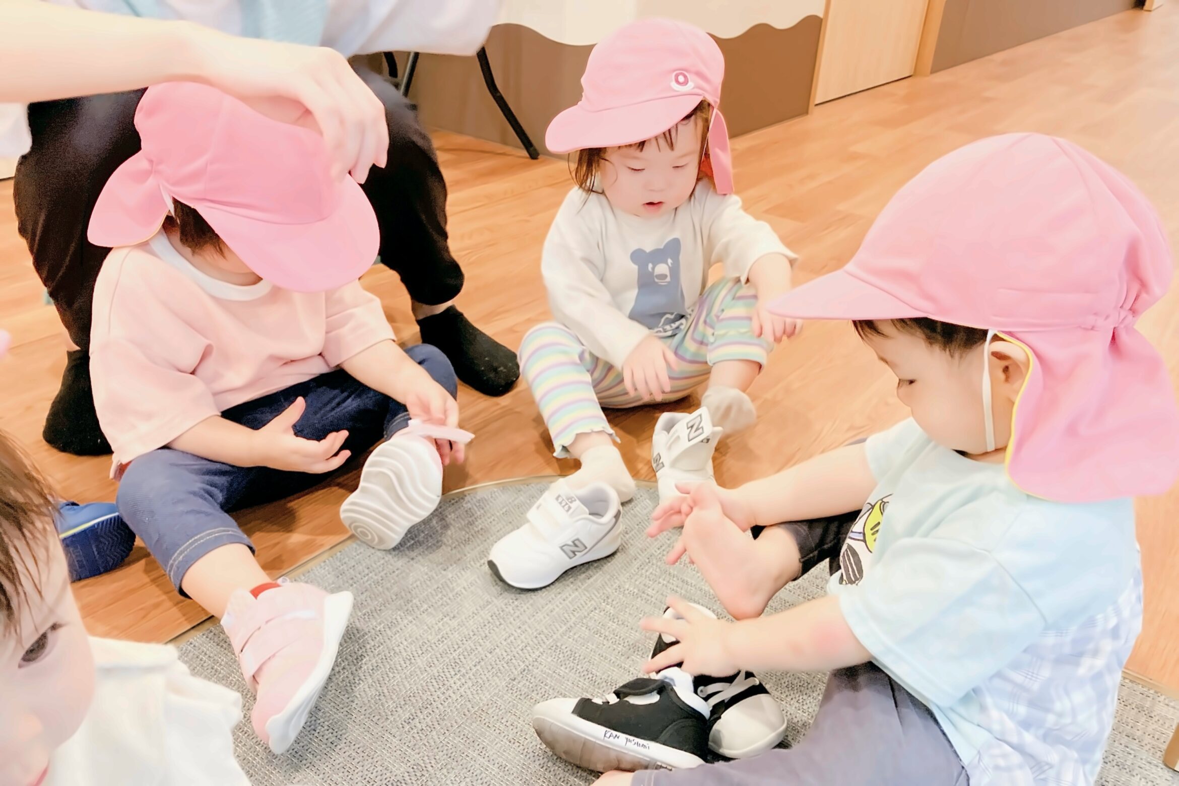 おさんぽに出るとき、自分たちで靴下や靴をはくように頑張っています。