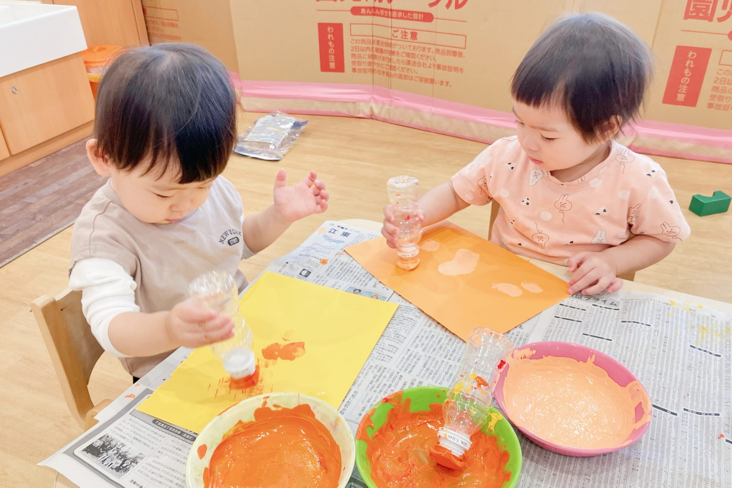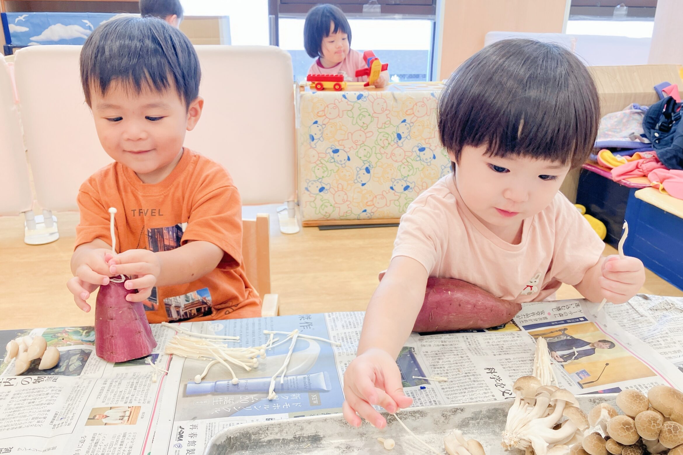 秋の味覚 さつまいもやきのこ類を思う存分触ったりにおいをかいだり・・左のおともだちは、何やら作っていますね。