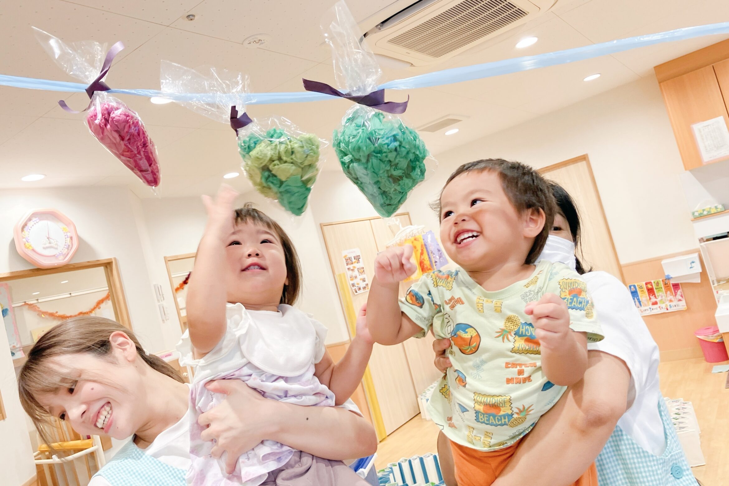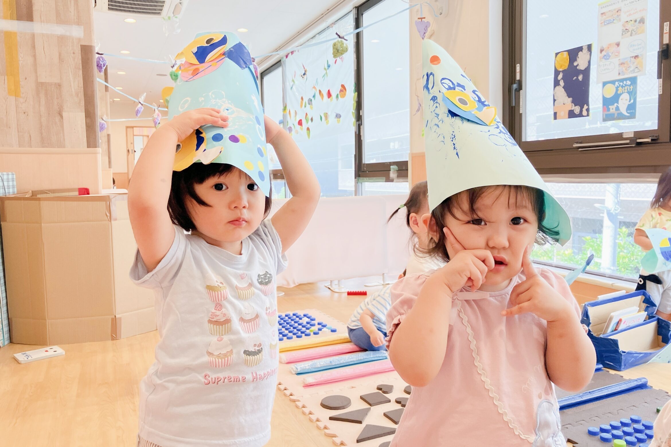 スタンプやシール貼りを楽しんだあと、先生が帽子にしてくれました。はいポーズ☆