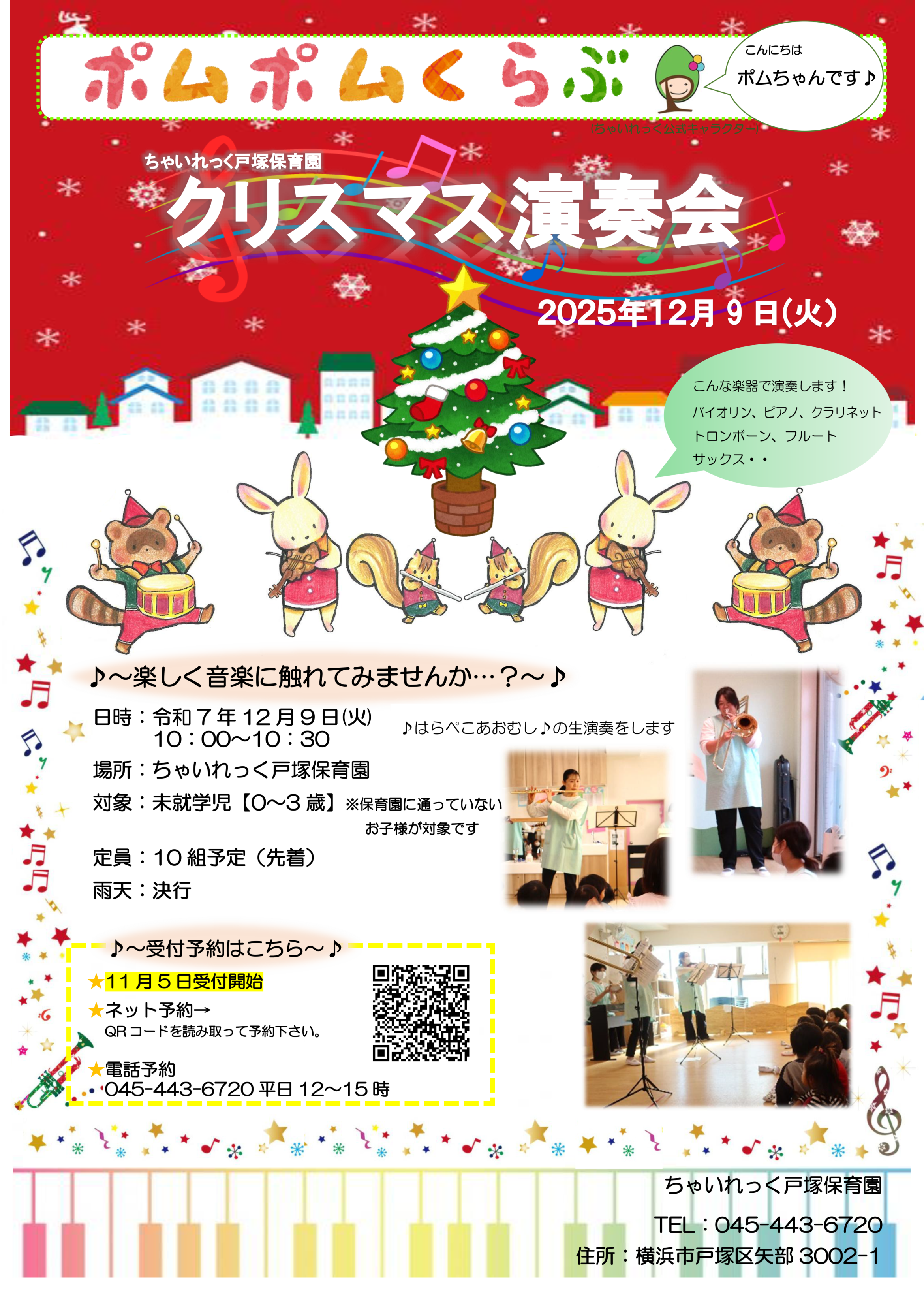 ちゃいれっく戸塚保育園でクリスマス演奏会を行います。クリスマスソング、はらぺこあおむしなど子どもが楽しめる音楽を演奏します!