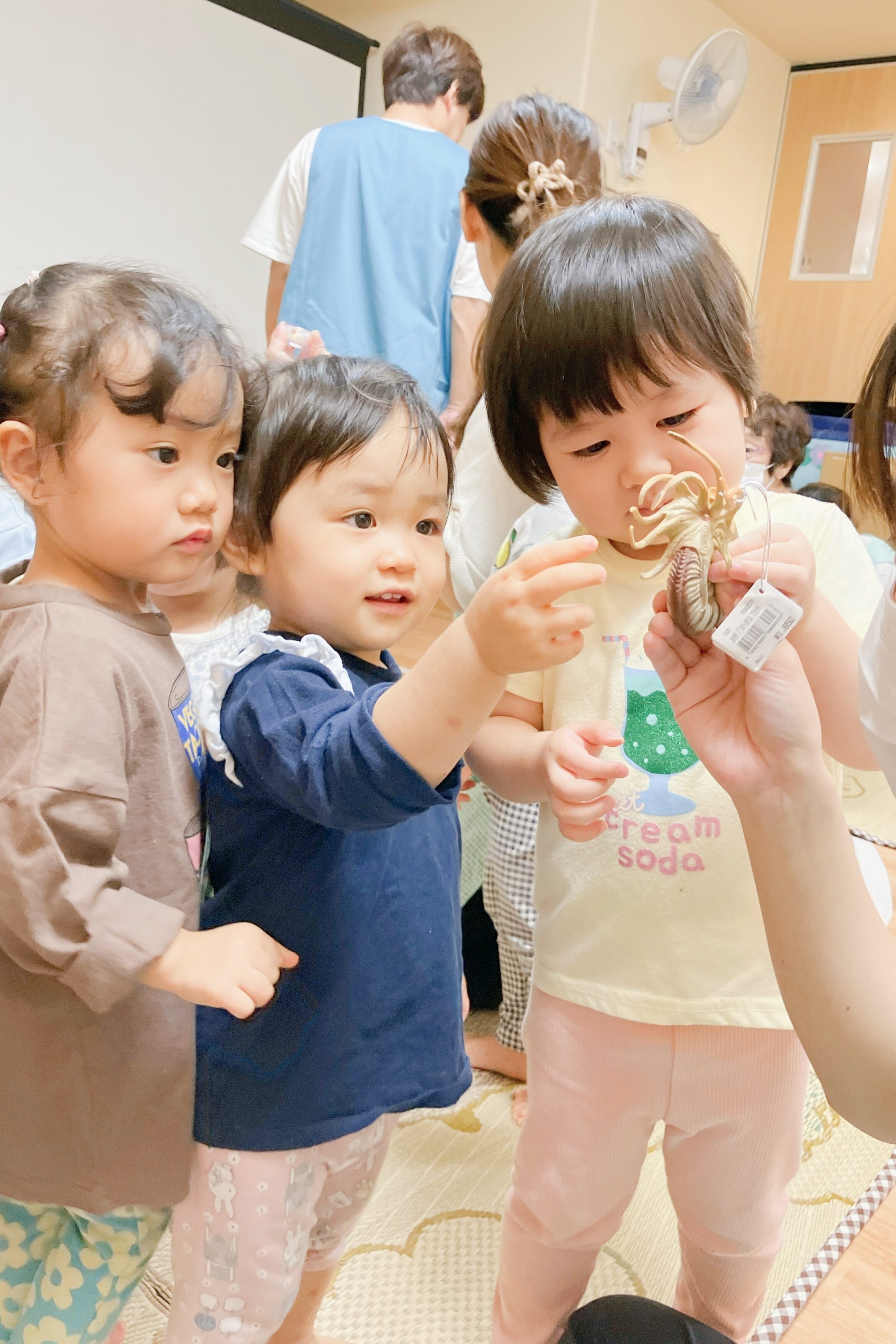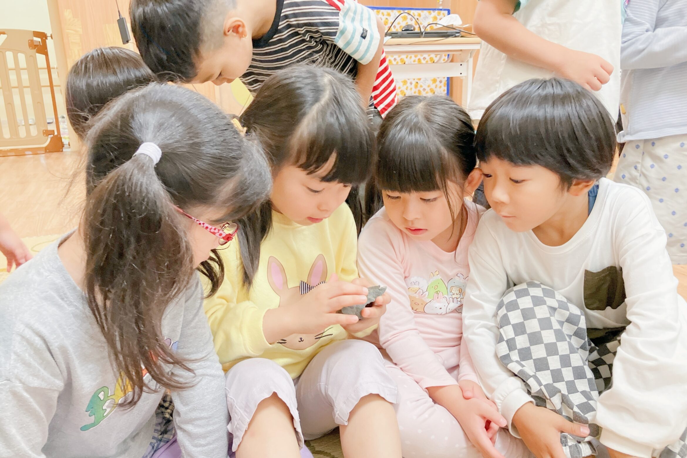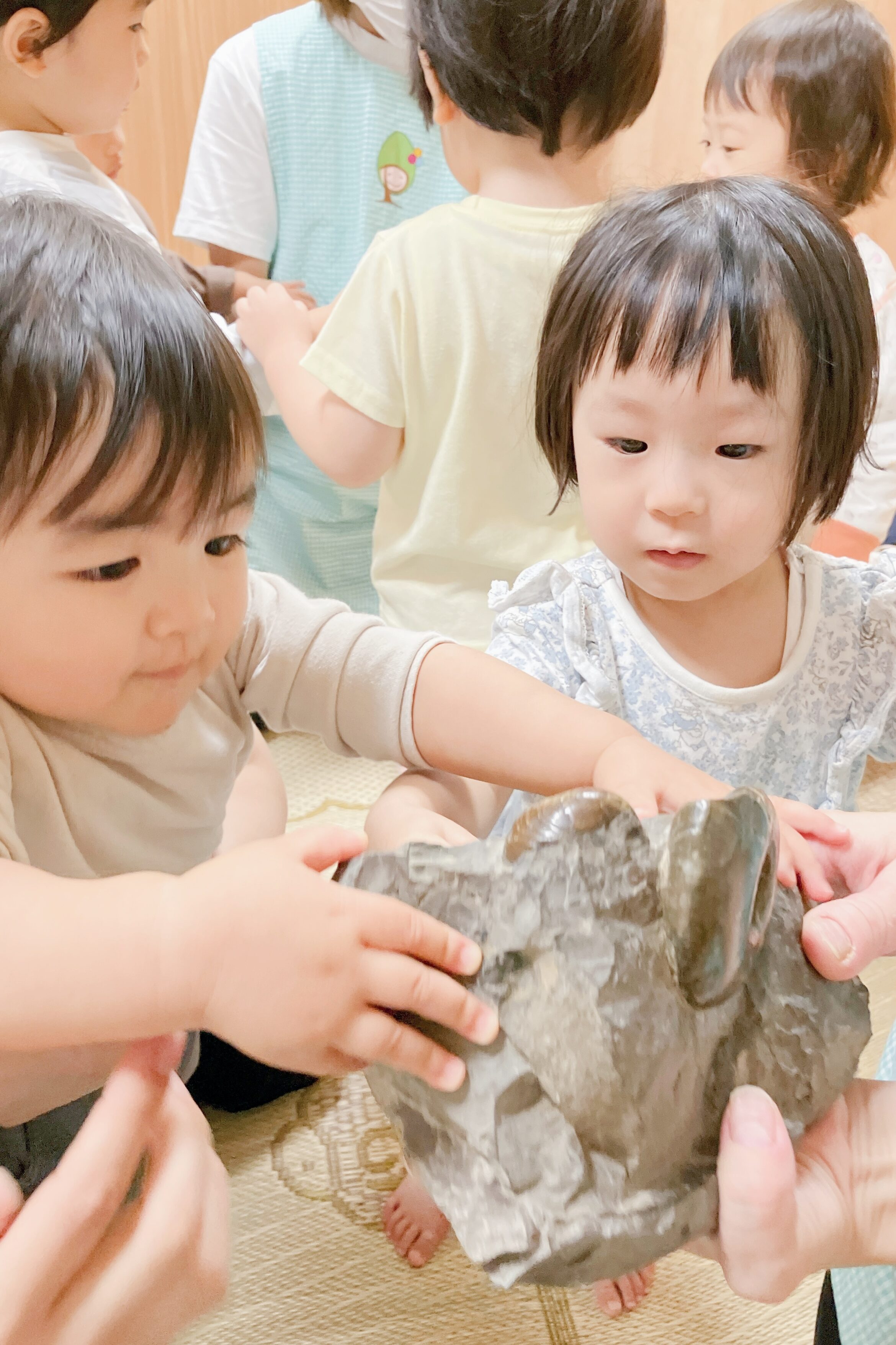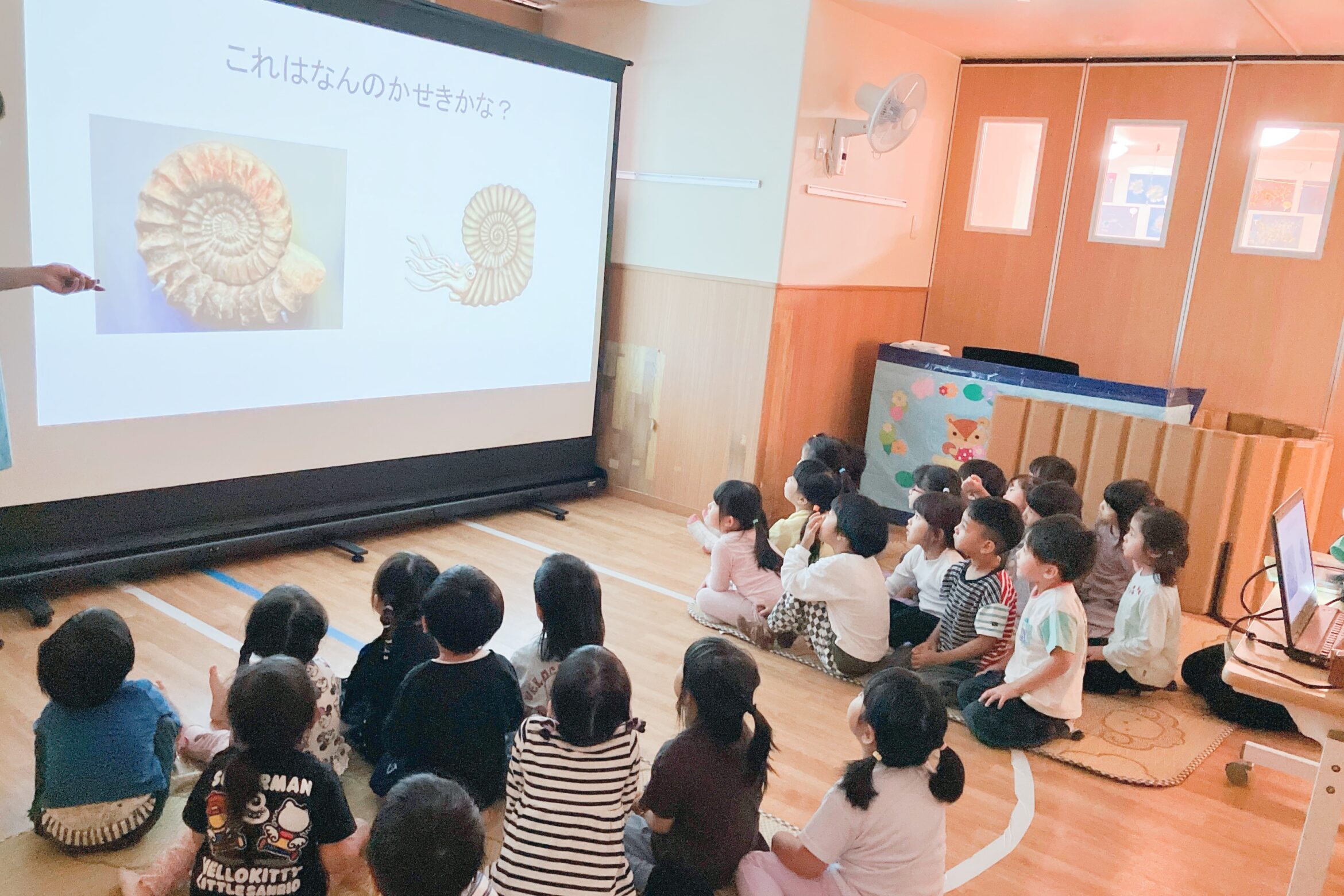 0.1.2歳児と3.4.5歳児、時間と内容を分けて「化石ってなーに?」、「どうやってできるの?」等について学びました。