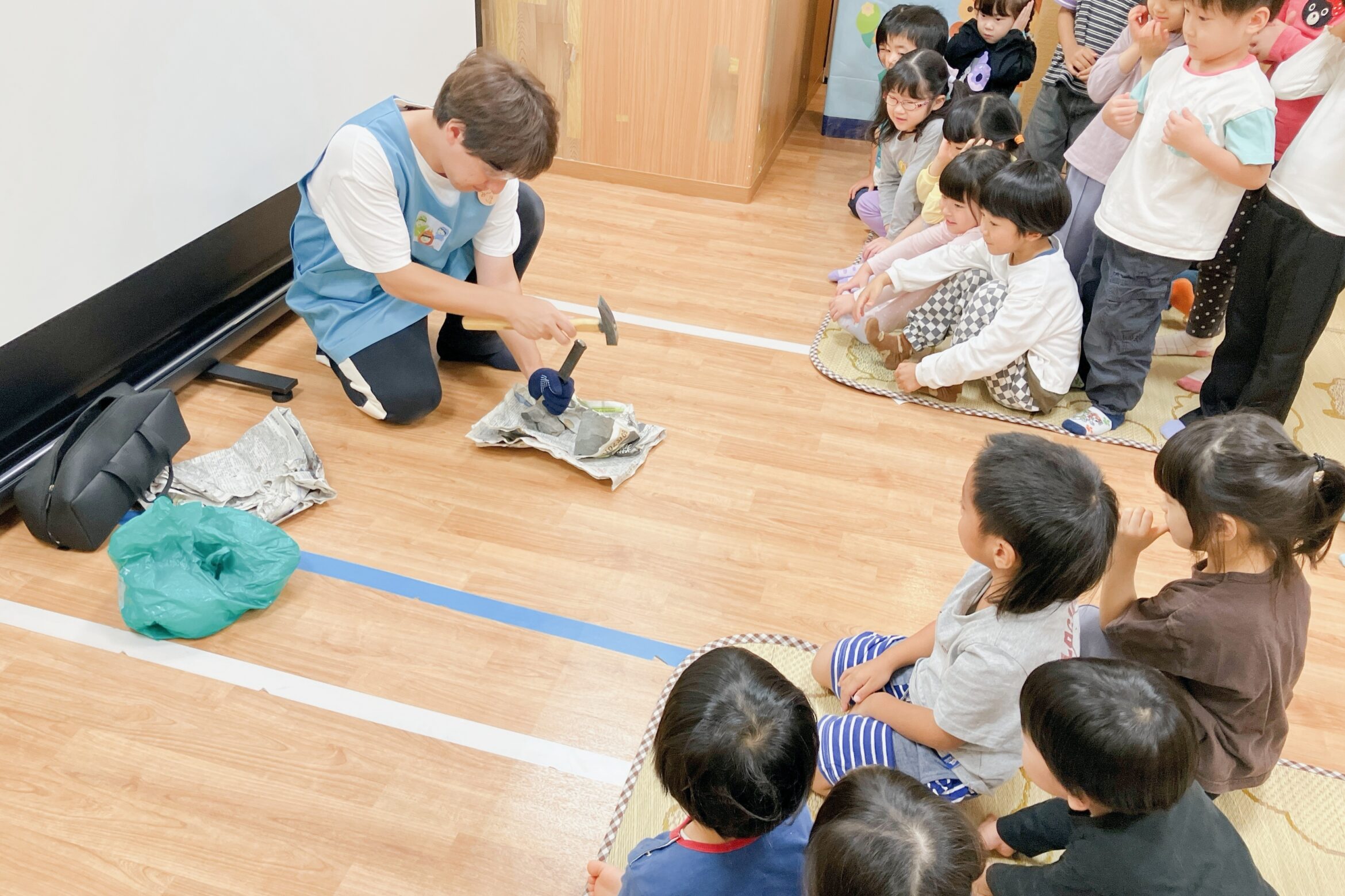 石の間に挟まってる化石を子どもたちの前で割って取り出す保育者