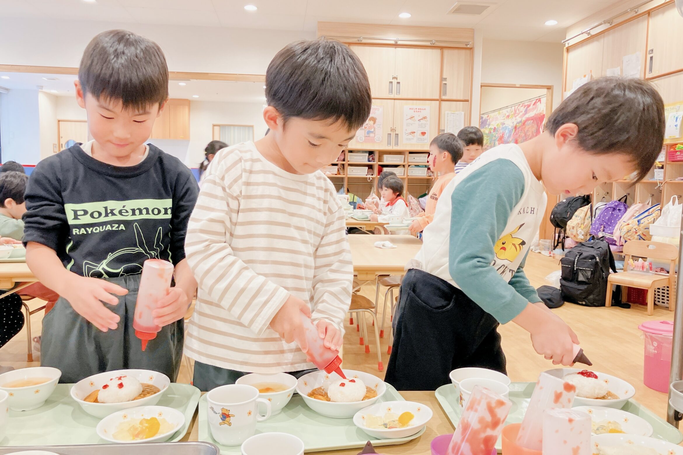 給食は、オバケカレー!4.5歳児さんはケチャップでオバケの顔を自分たちで描き美味しくいただきました。