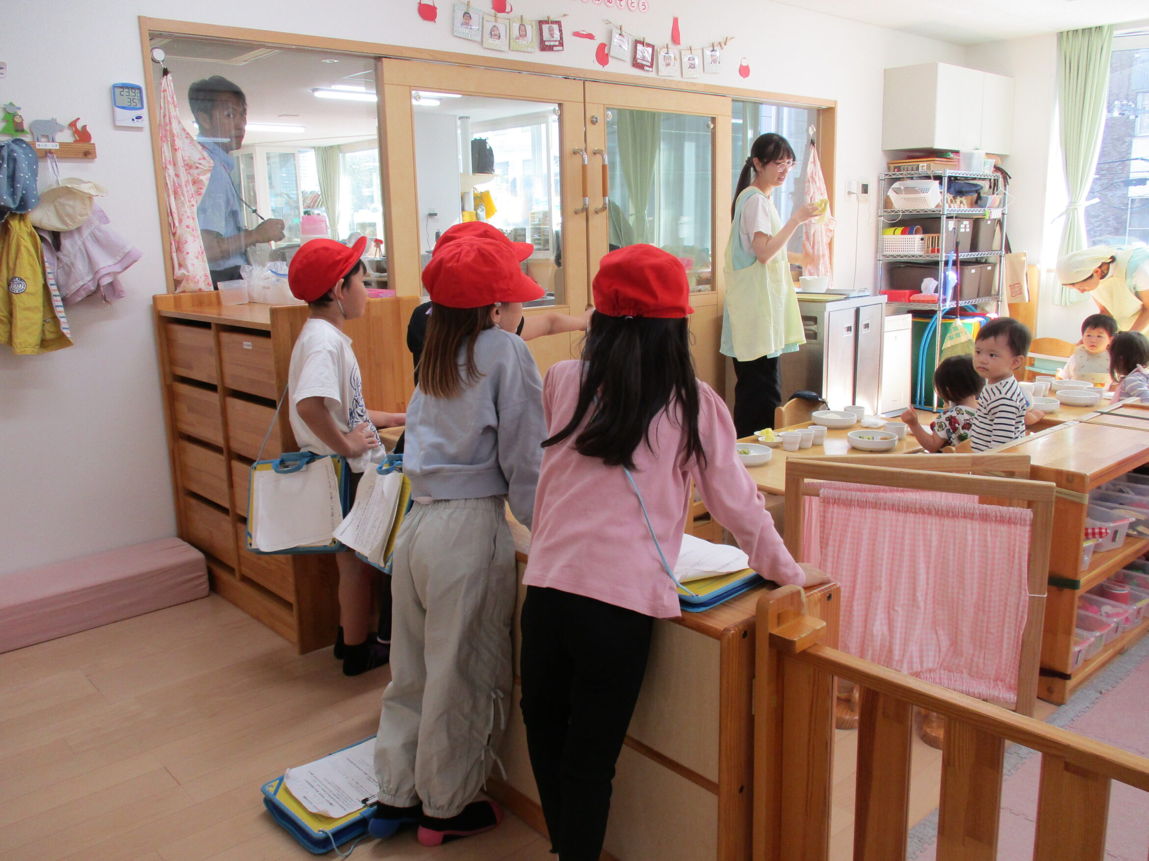 1歳児クラスを見学。昼食時間のせんせいの様子を見ています。