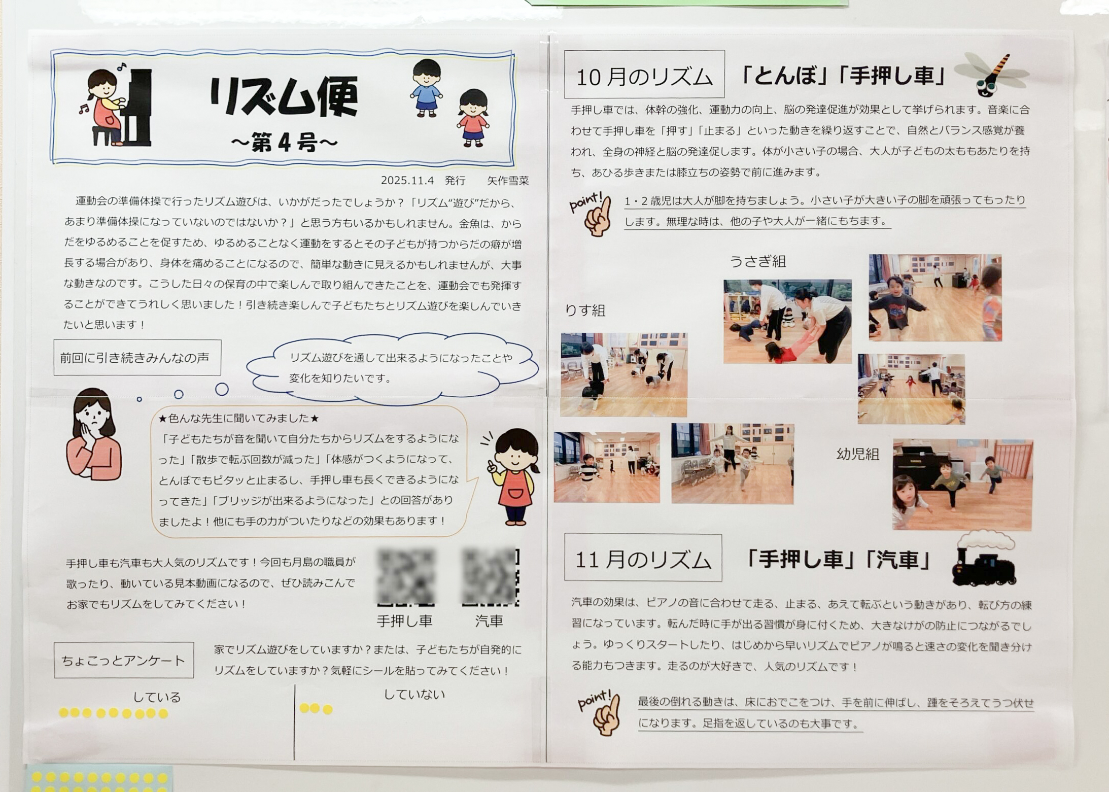 そんな保護者のみなさまの声に応え、月島駅前保育園では2か月に一度「リズム便」をお届けしています!!リズム便ではリズム遊び一つひとつの動きのポイントや、その動きでどんな発達が促されるのかを説明しています。