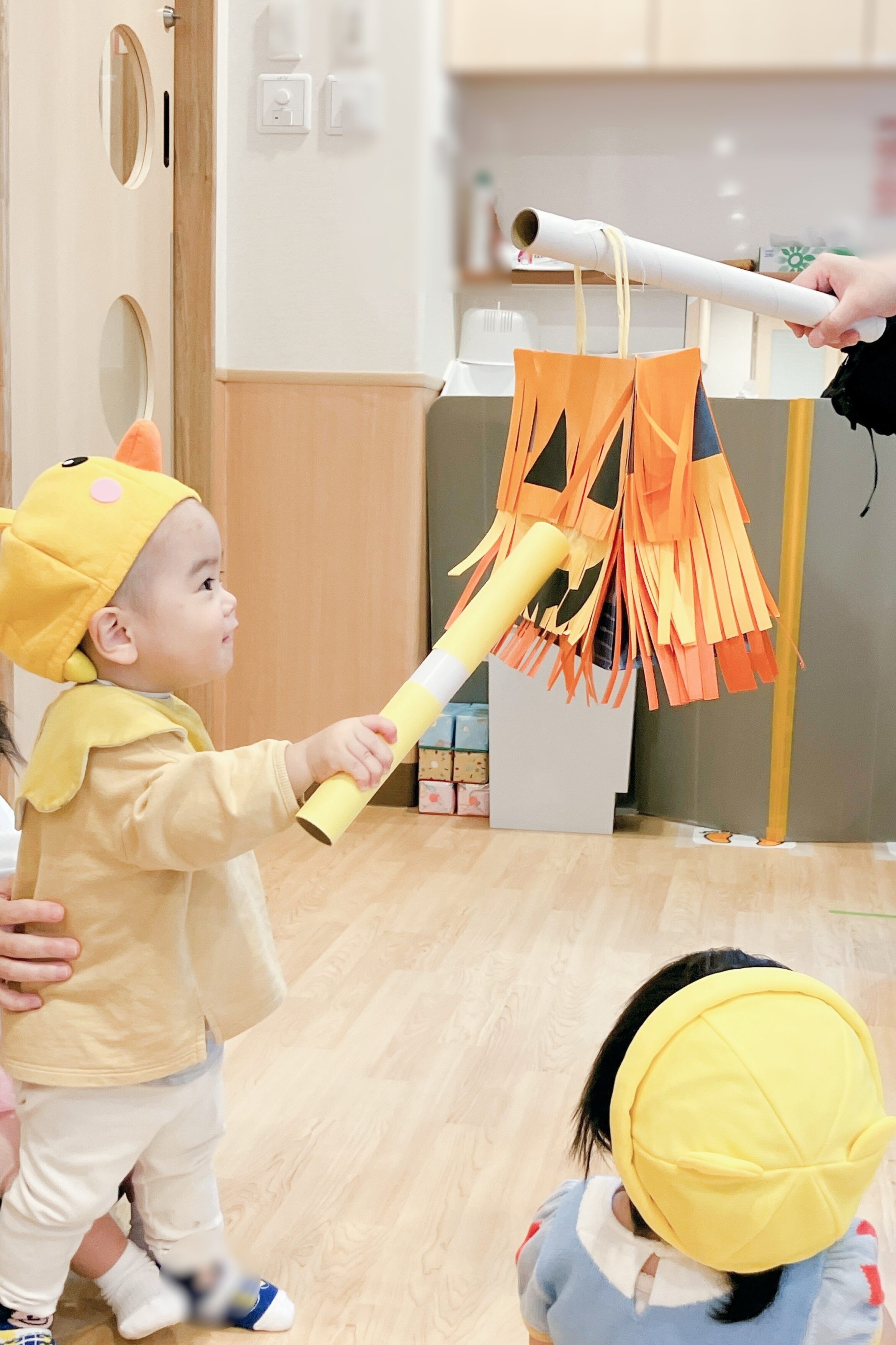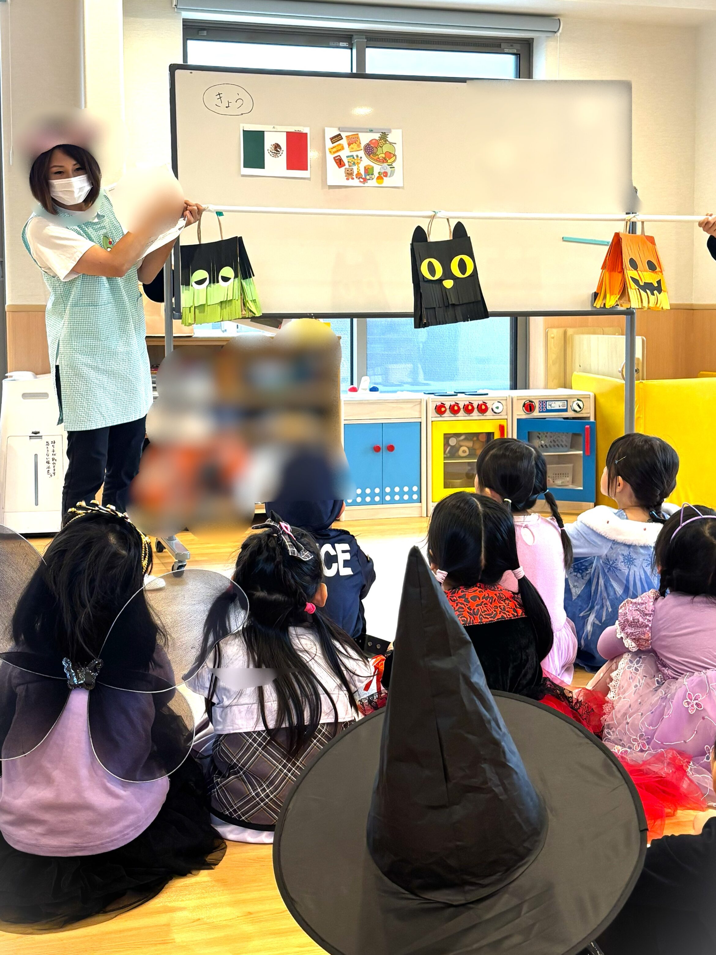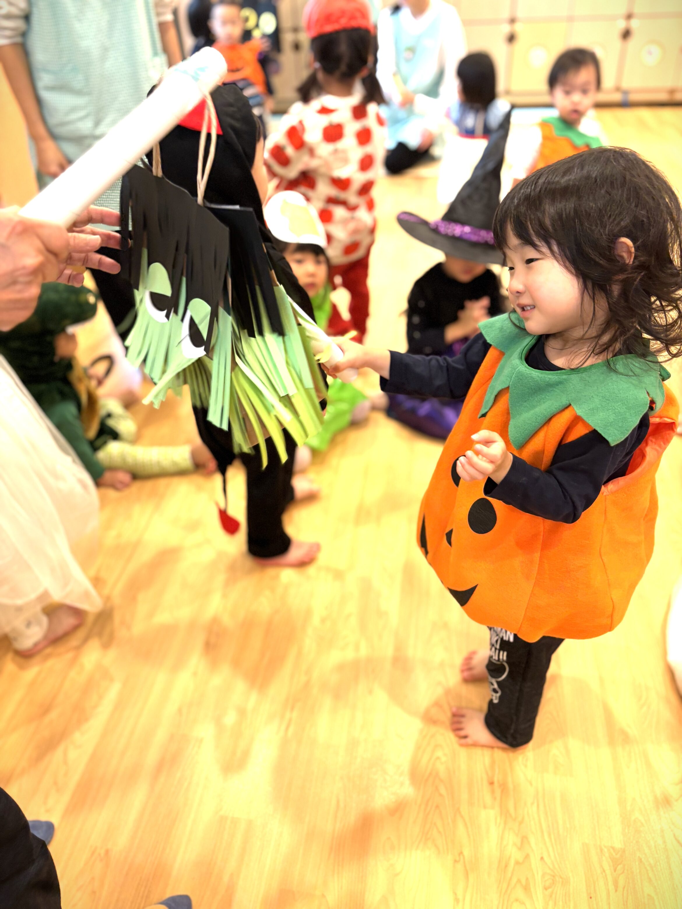 10/31は全園児で『ハロウィン集会』を行いました。今年のハロウィンは、0~2歳児クラスと3~5歳児クラスに分かれて、みんなでピニャータを楽しみました。