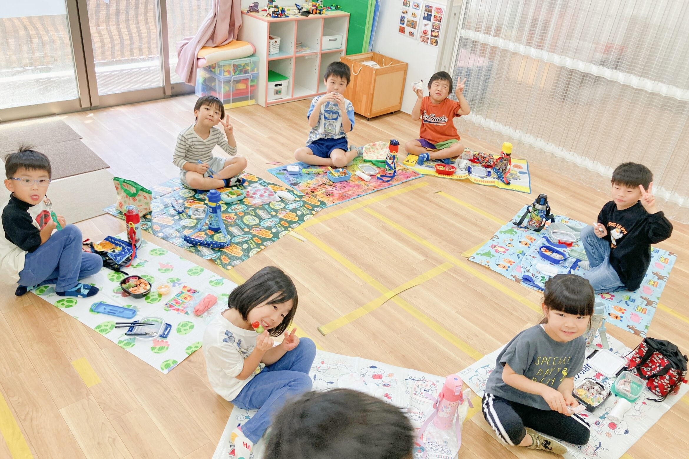 園に帰ってからはお待ちかねのお弁当タイム。「これおいしいよ」「見てみて」と楽しそうにお話ししながら食べたりする姿は、まるで本当のピクニックに来たかのようでした。