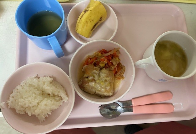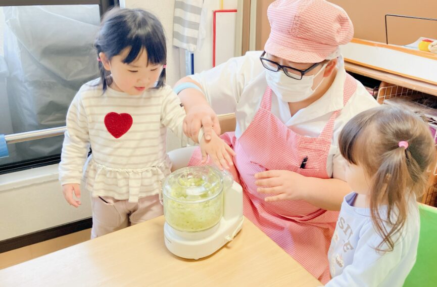 毎月食育活動をしていますが、保育室の真ん中にある給食室から声をかけてすこーしですがお手伝いをしてもらうこともあります。