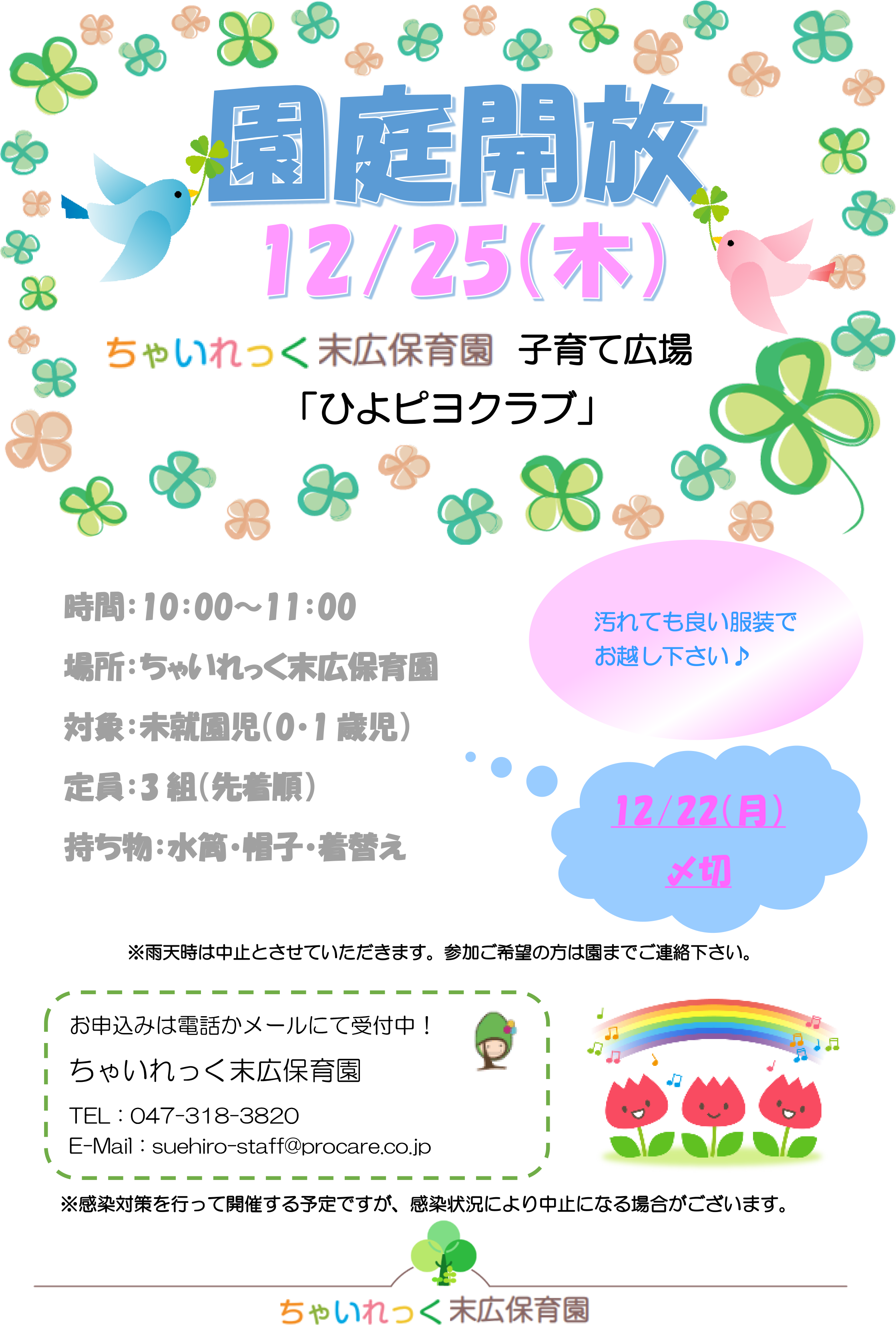 園庭開放に遊びに来ませんか?詳細をご確認のうえ、お電話またはメールにてお申込みください♪