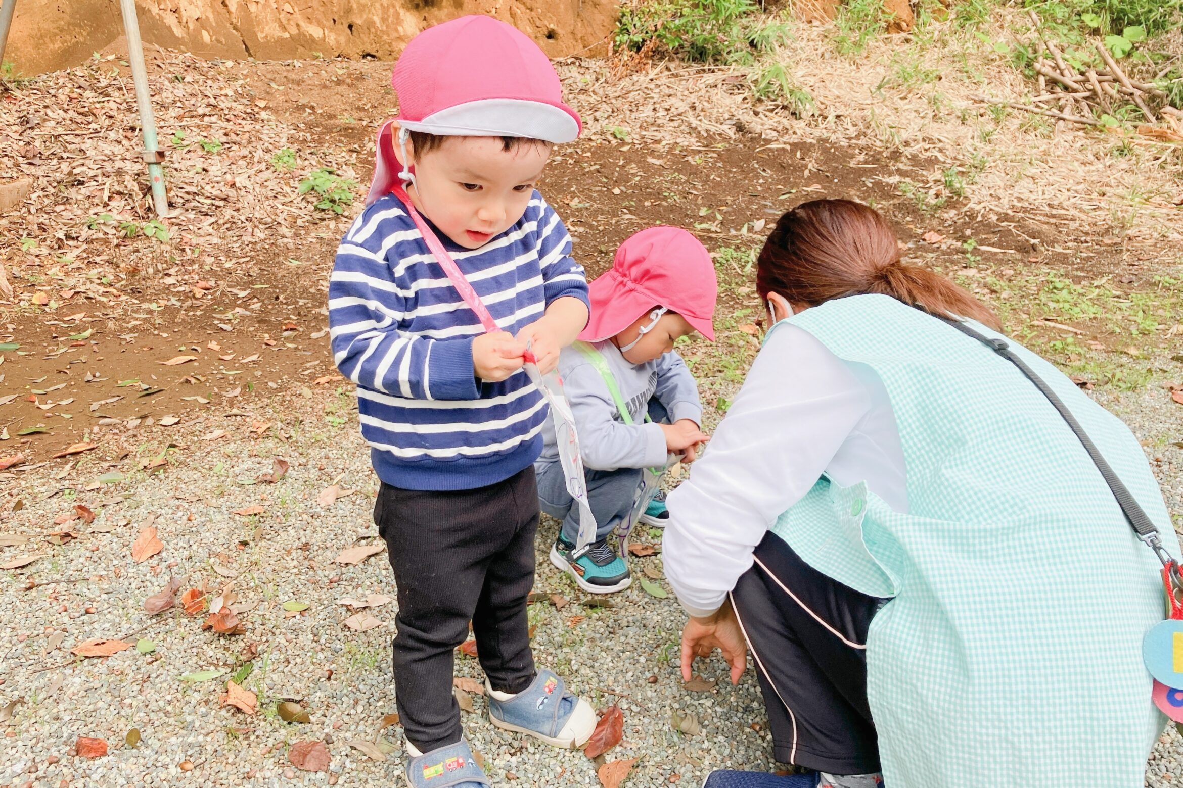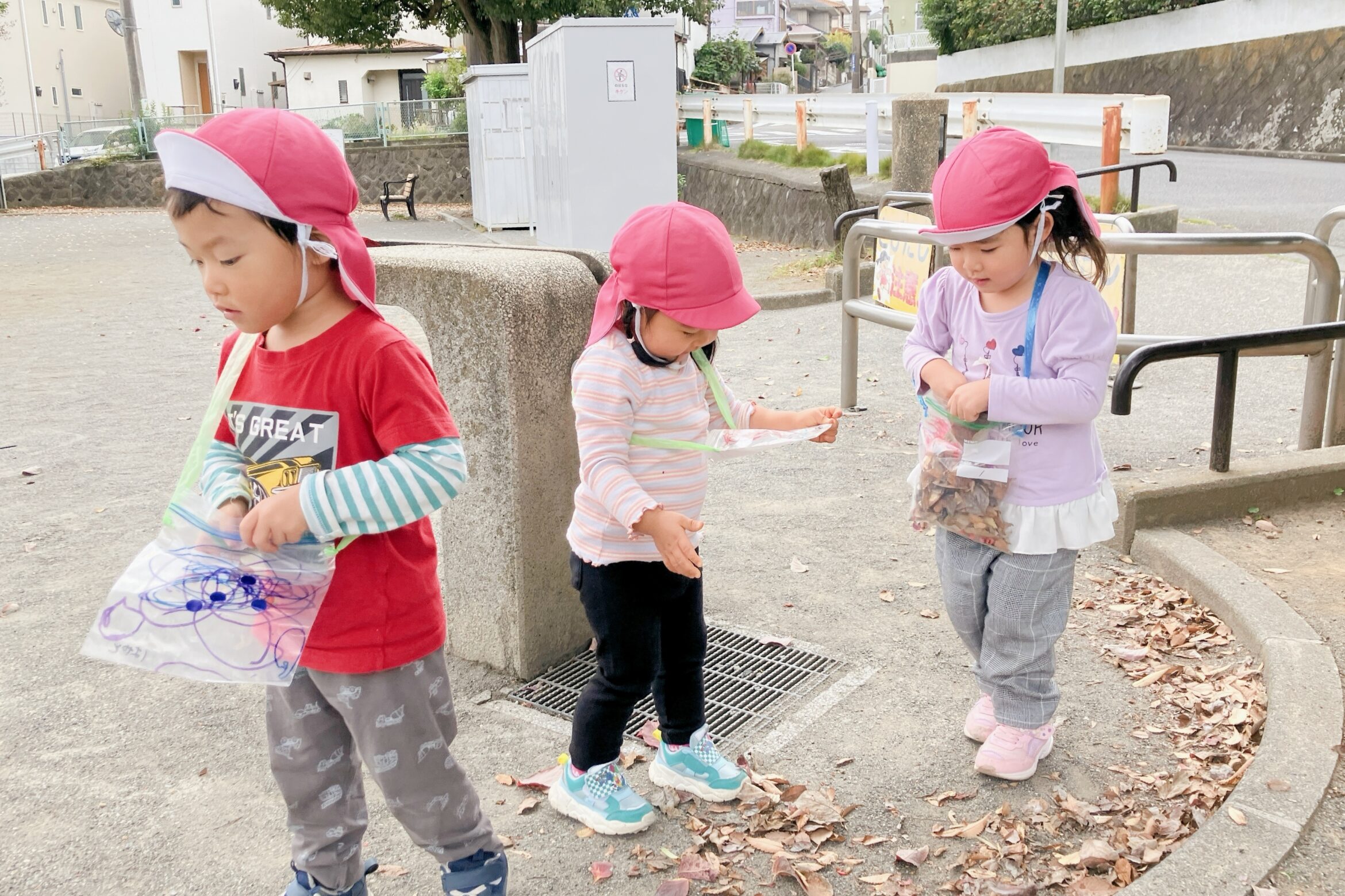 たくさんのどんぐり!黄色のイチョウの葉や赤い桜の落ち葉を拾いました。自分たちで作ったお散歩バックに詰め込んで嬉しそうに持ち帰りました。