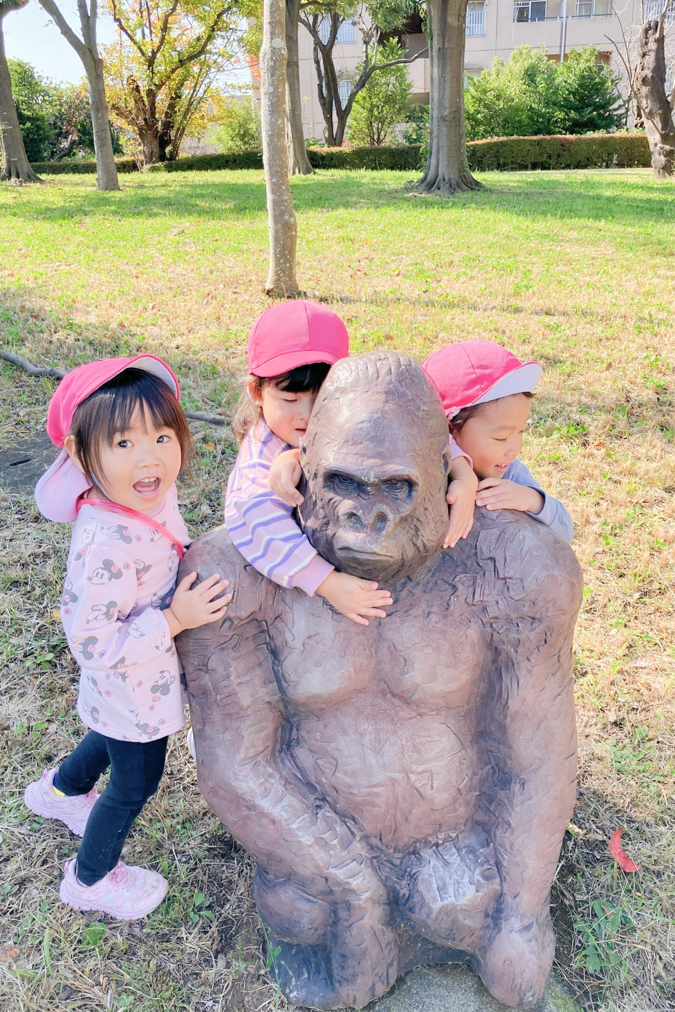 散歩道にあるゴリラさん。みんな大好きで抱き着いてご挨拶。