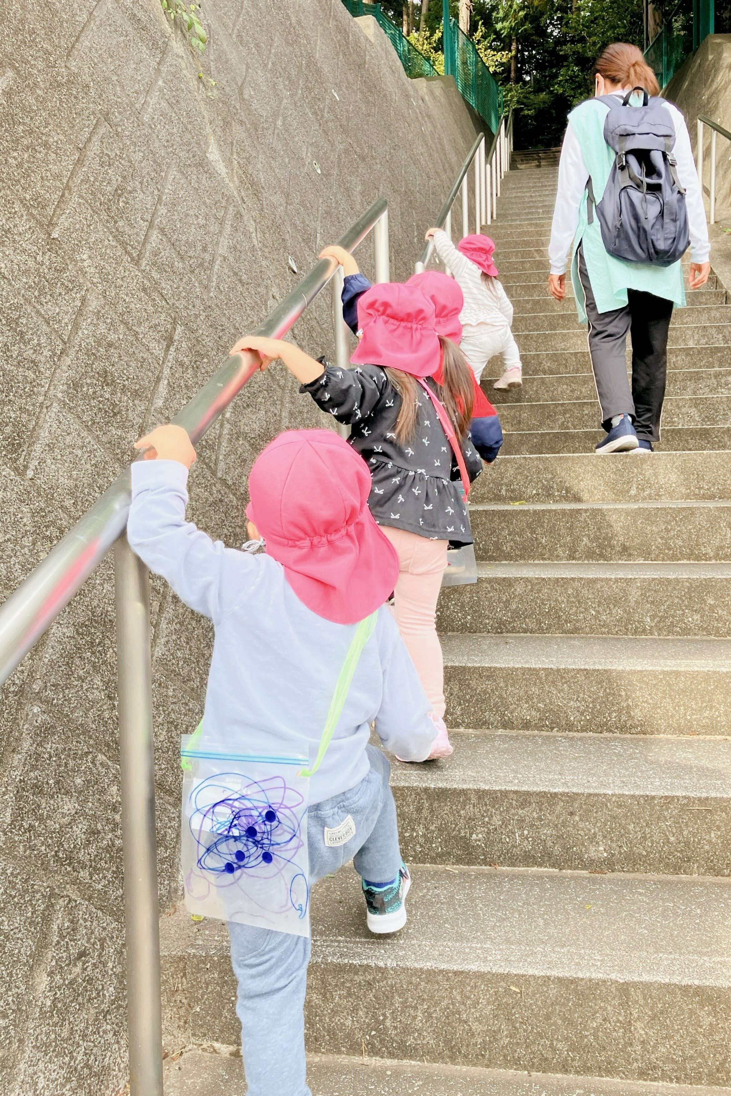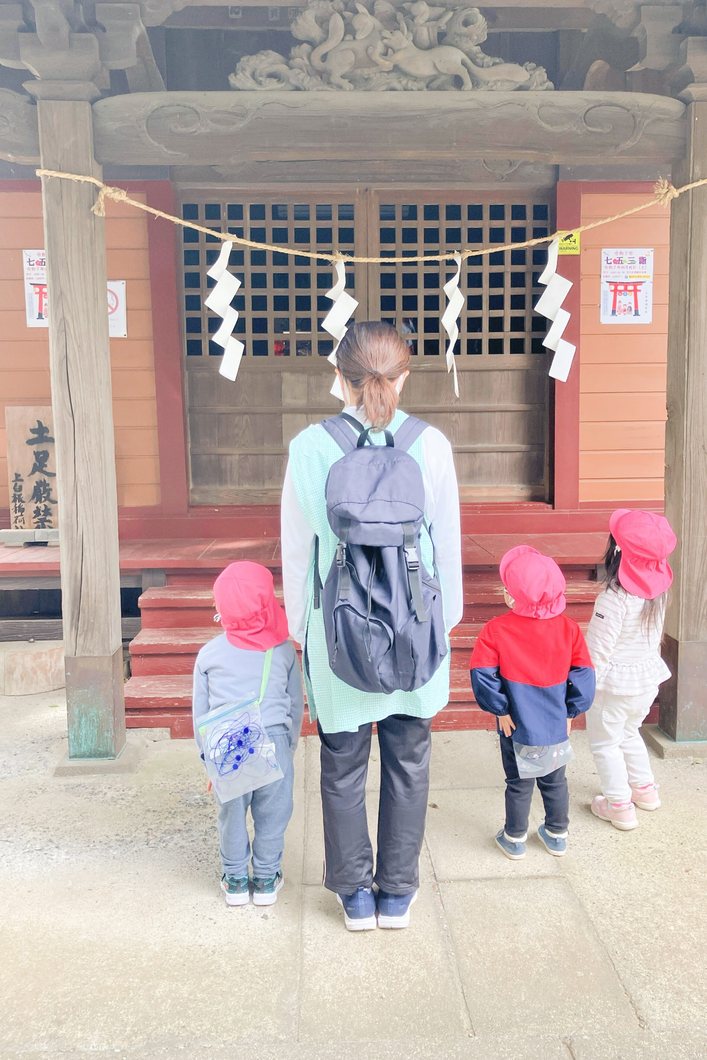 2歳児クラスは足どりもしっかりしているので長い階段を登って神社へ行きました。お稲荷さんの横を通るときは少しドキドキ…緊張していました。