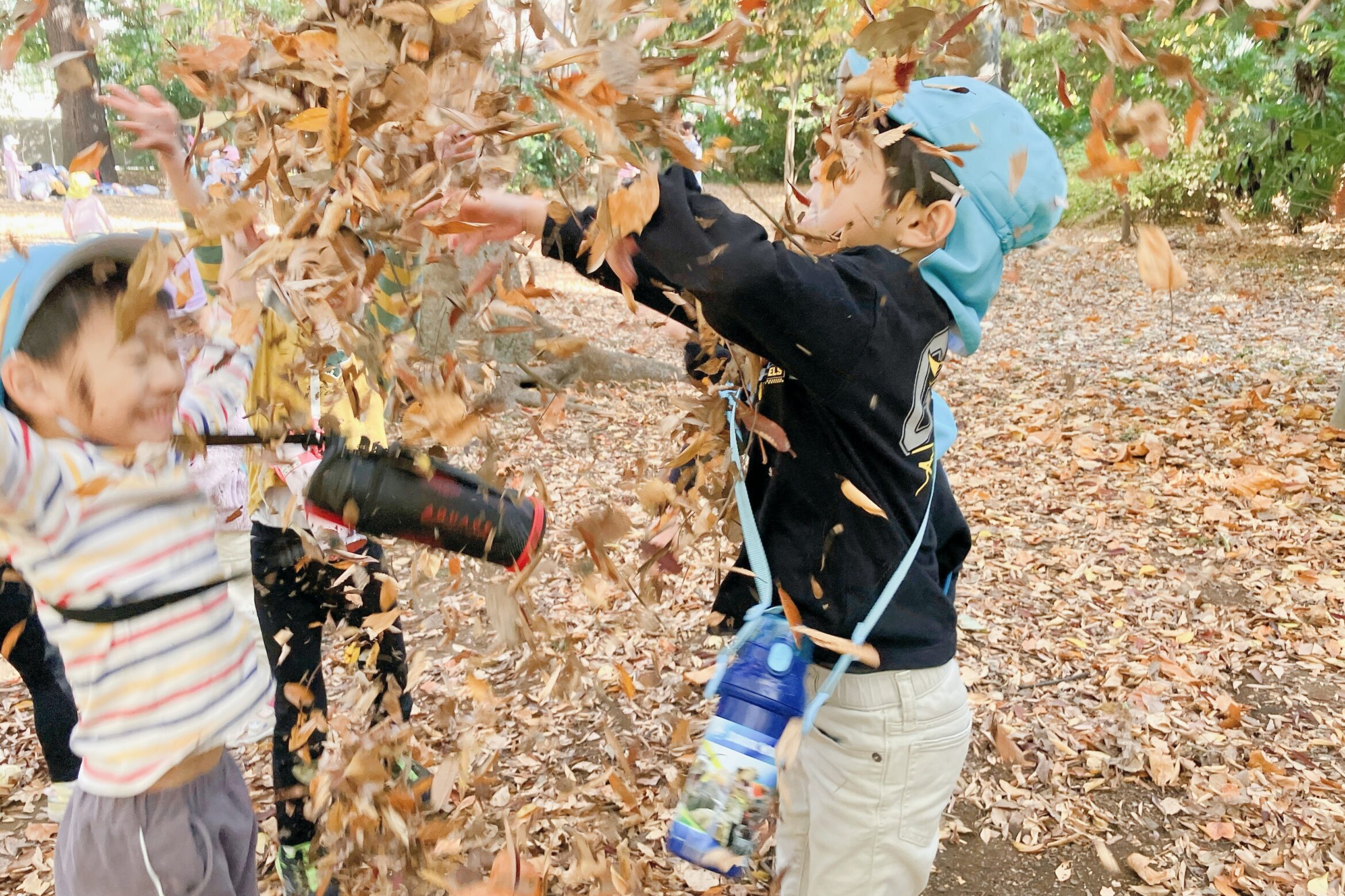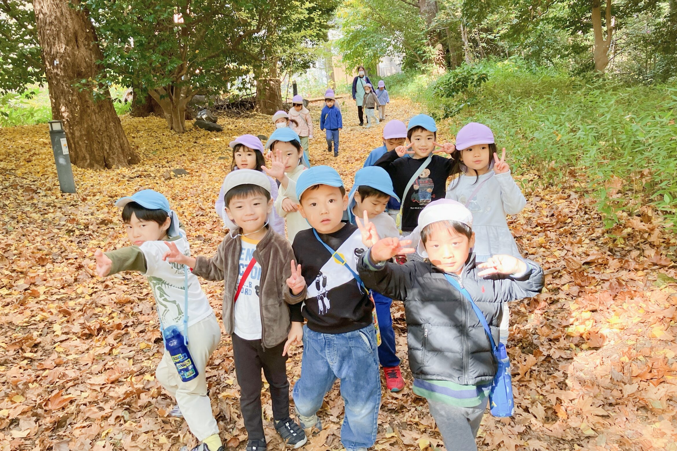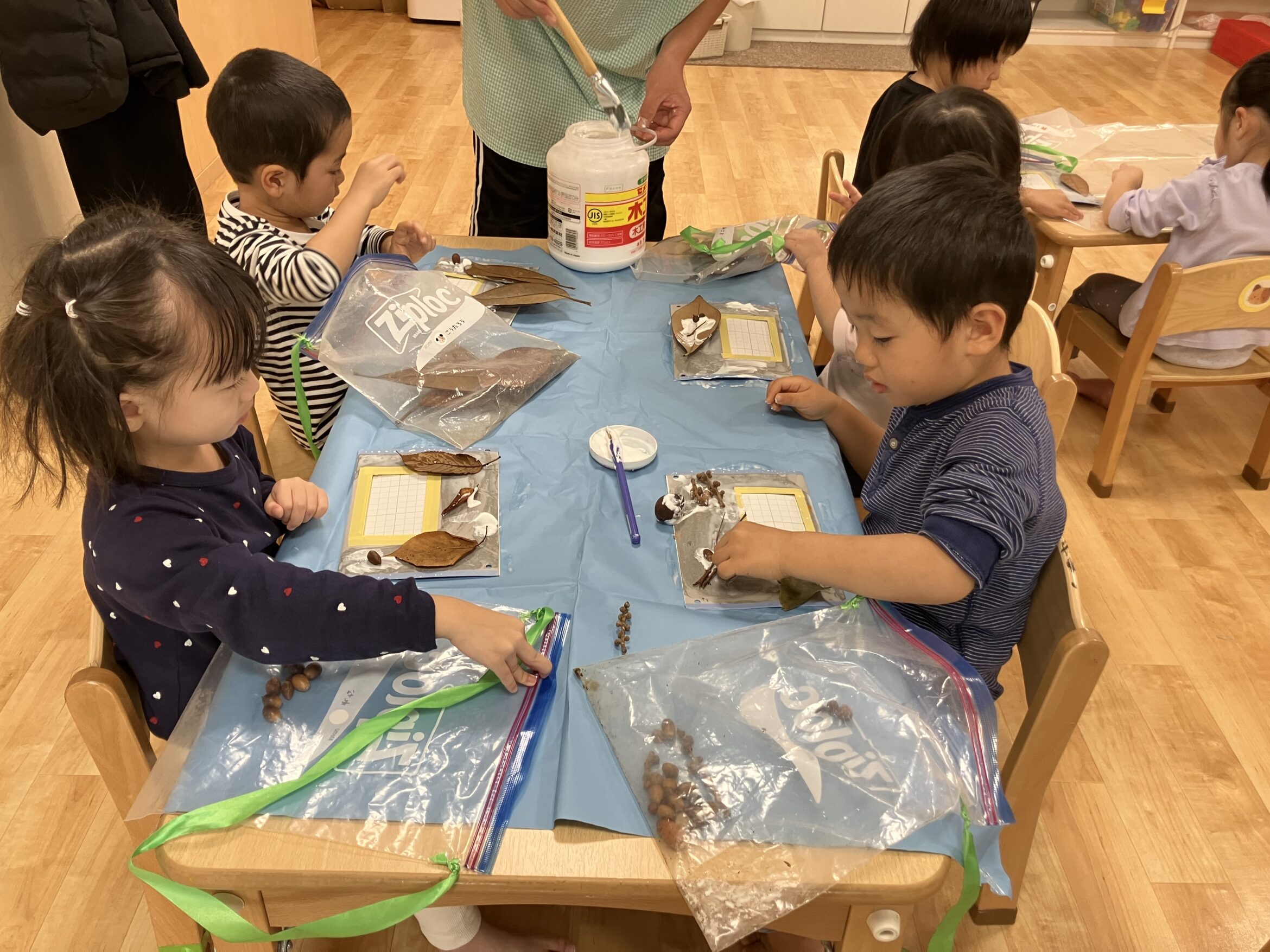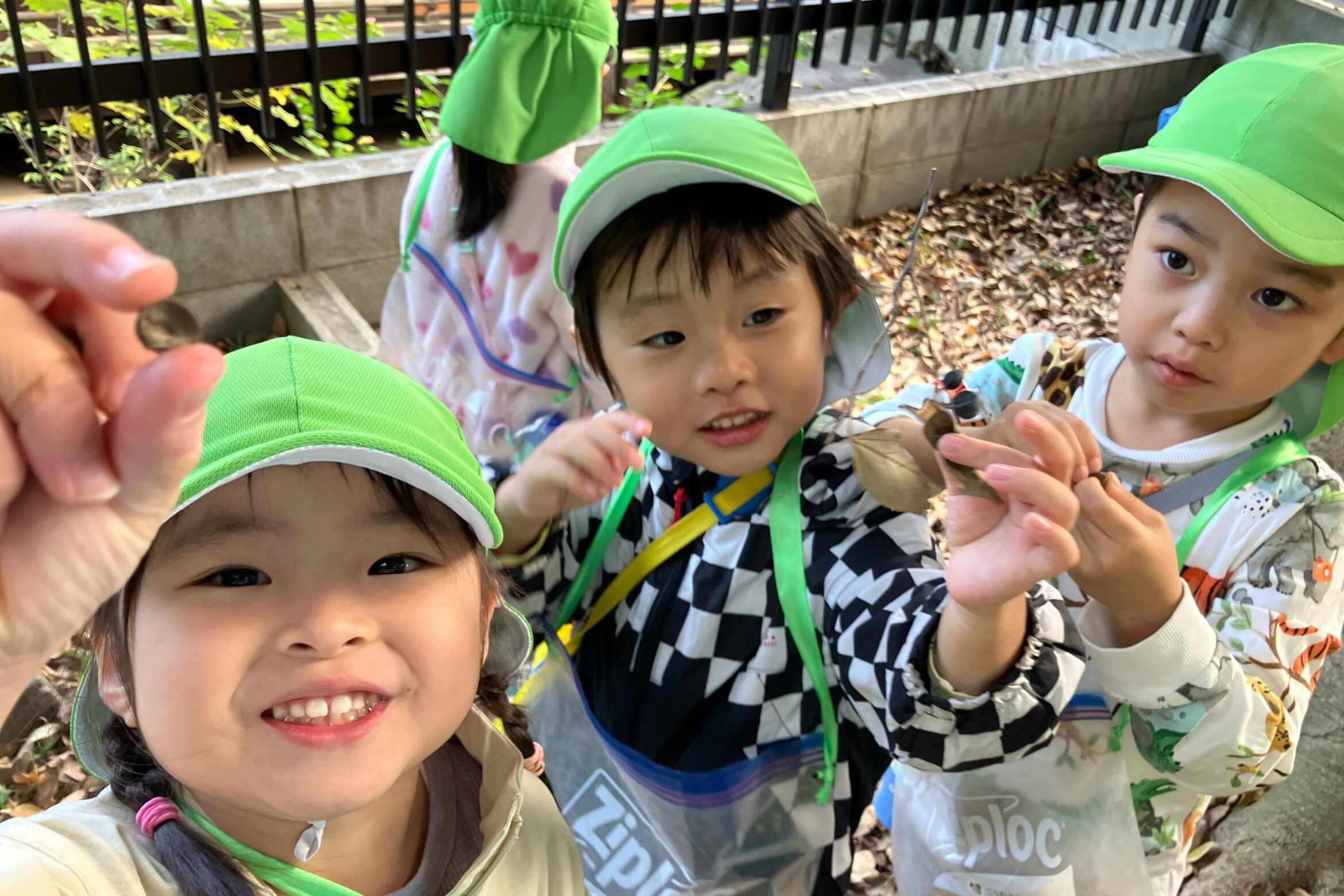近隣の神社や公園で、落ち葉や木の実を拾って自然あそびを楽しみました🍂