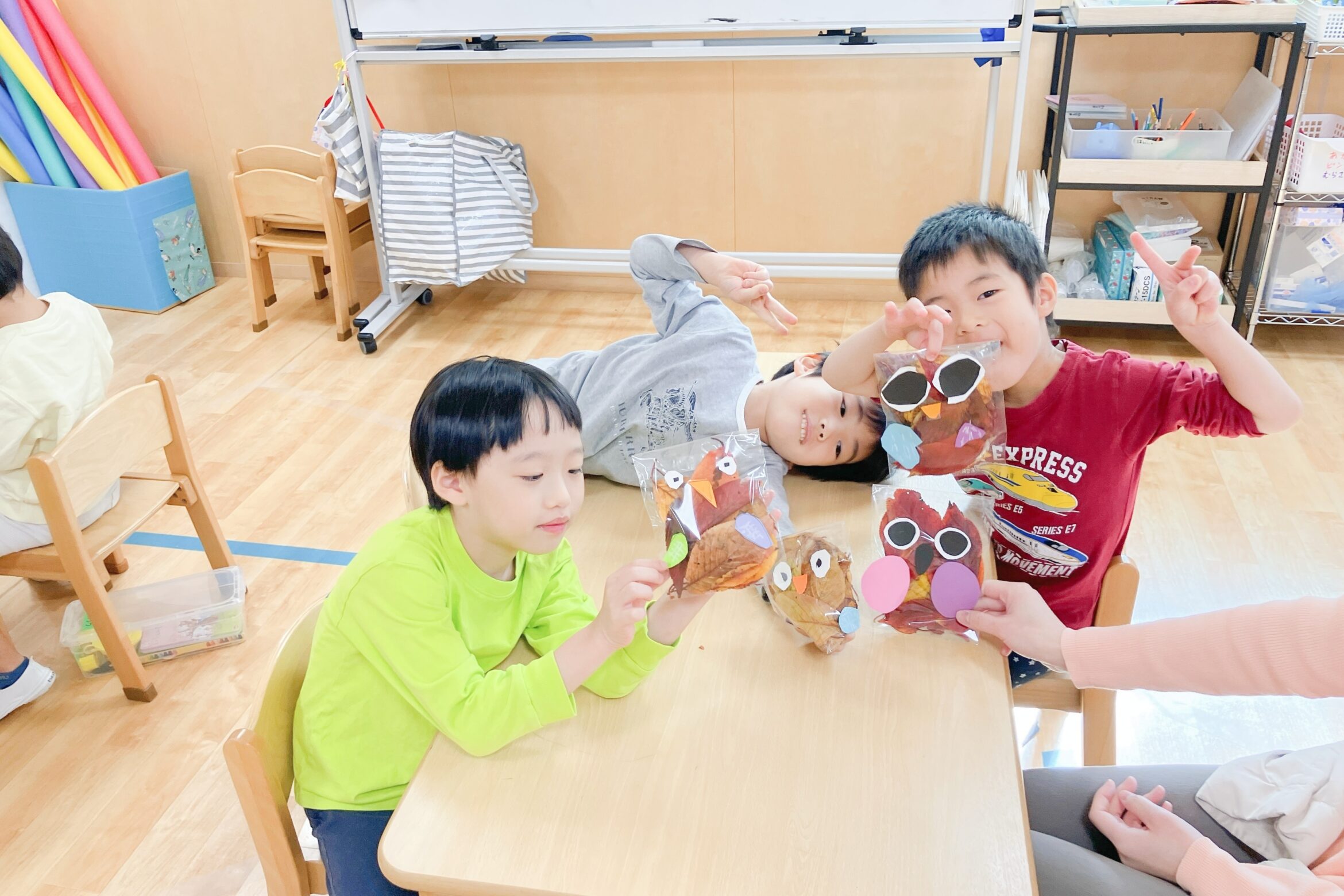 落ち葉を袋に詰めて、ステキなフクロウが完成しました🦉