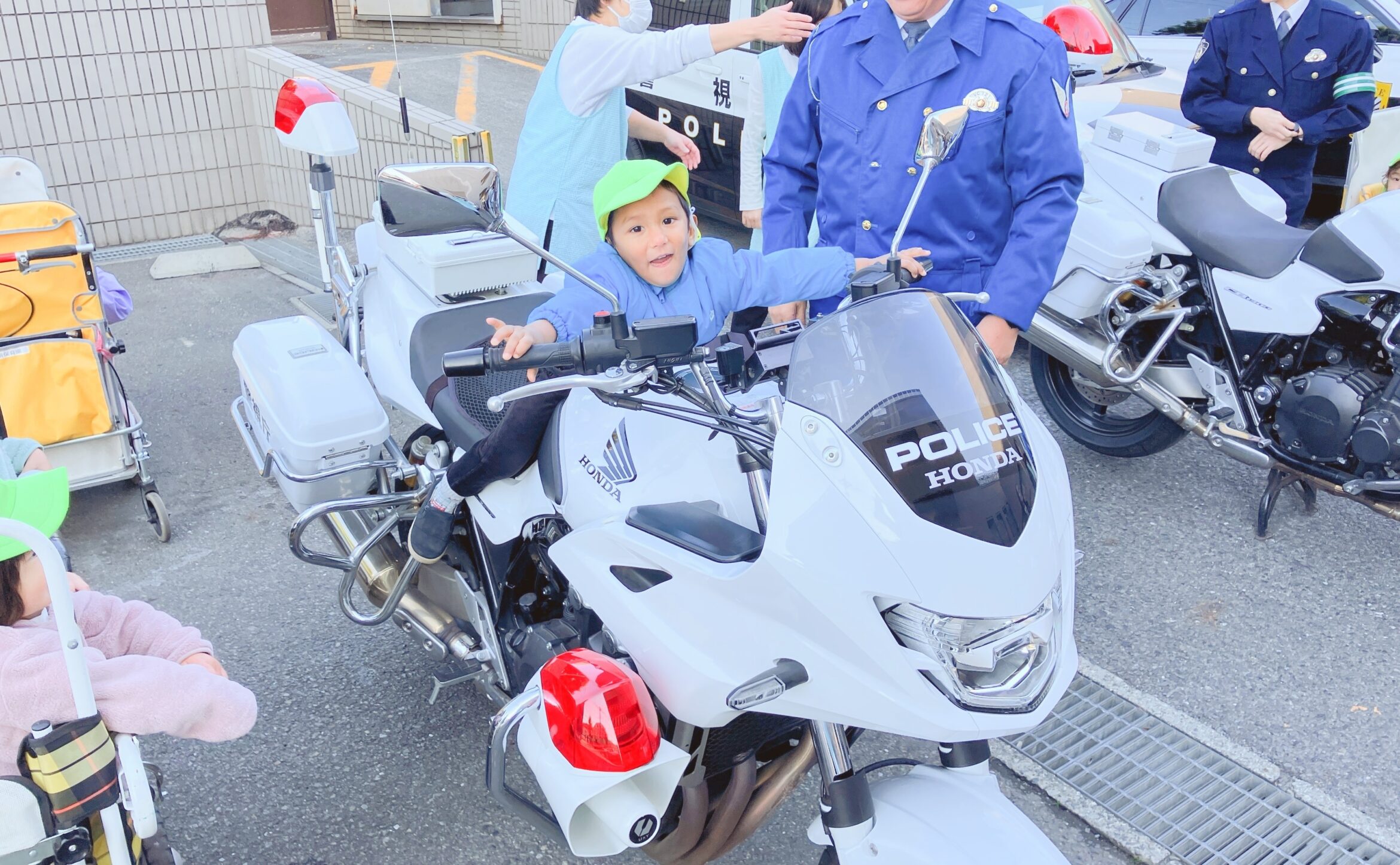 一人ずつ順番に白バイクに乗せてもらい記念写真を撮りました!子どもたちの素敵な笑顔が見れました♪