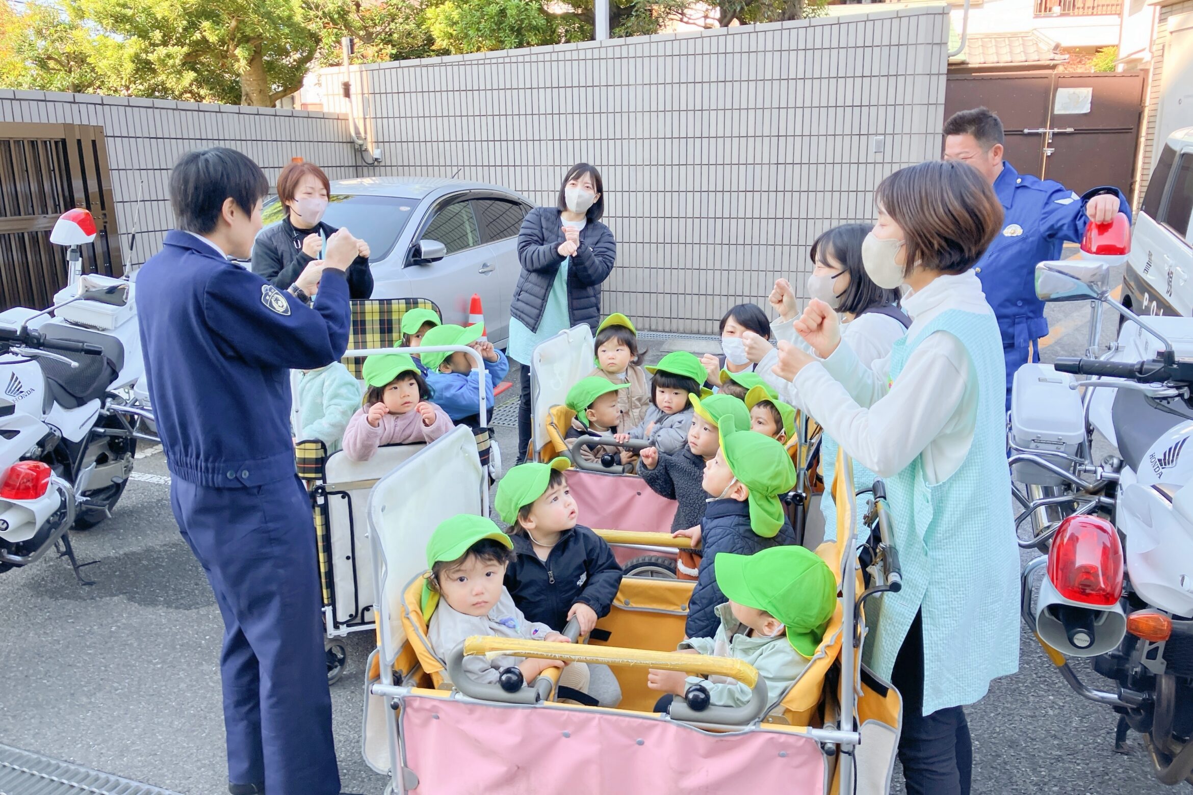 11月は1歳児クラスと2歳児クラスで「福生警察署訪問」がありました!いつもと違うお散歩の道にわくわくする子どもたち♪