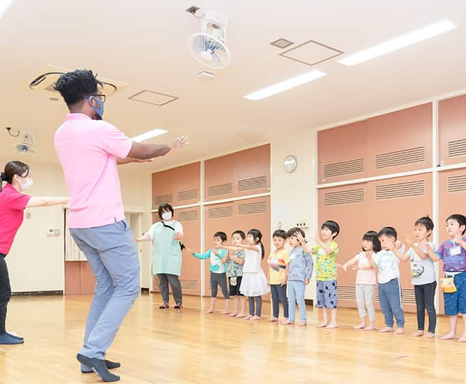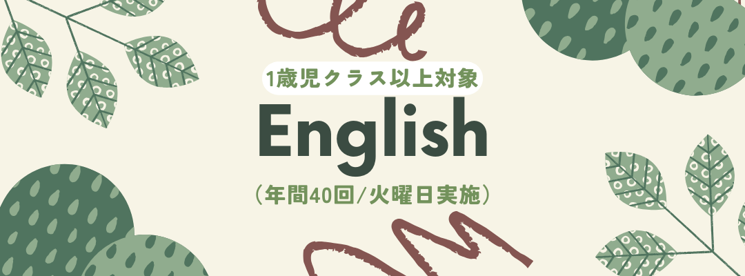 英語で挨拶から始まり、音楽に合わせて体を動かしたりしながら自然と英語が身につく環境をつくっています。クラス毎に時間を設けていますので、年齢があがるごとに楽しく英語に触れあえる機会が増えていきます。