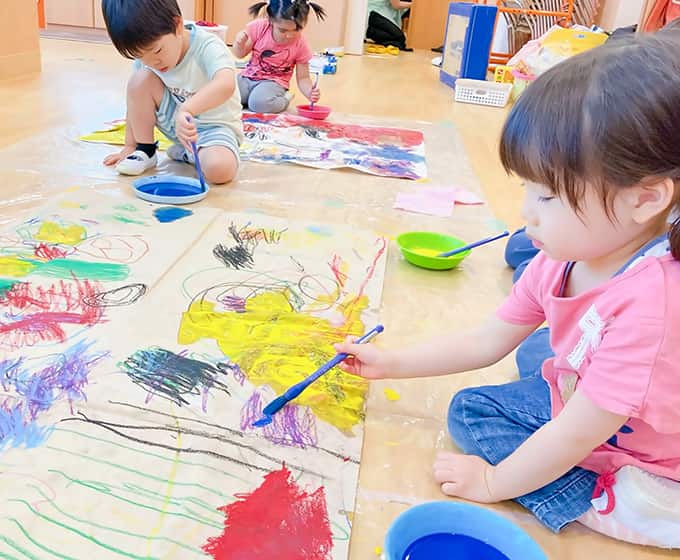 「あそび」ながら「創造」する力を養う絵画造形教室では、カワイ音楽教室の先生と一緒にさまざまな素材を使用しながら、作品をつくっていきます。