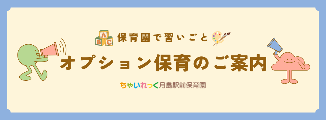 ちゃいれっく月島駅前保育園では、オプションとして水泳・英語・絵画造形のプログラムを行っています。保育時間の中で習いごとができるので、保護者さまの送迎などのご負担はなく、さまざまな経験をしていただけます♪詳細は以下をご確認ください。