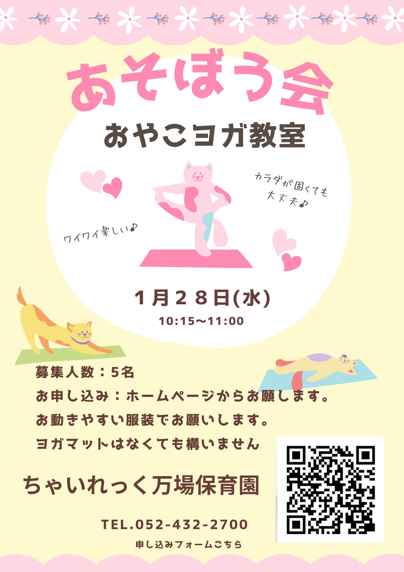 2025.12.26 万場保育園 1月 あそぼう会 おやこヨガ \ 保育園に遊びに来ませんか? /1月のあそぼう会は、親子でヨガ教室です♪ ワイワイ楽しくカラダを動かしましょう!持ち物は水筒と帽子です。 ご予約はこちら