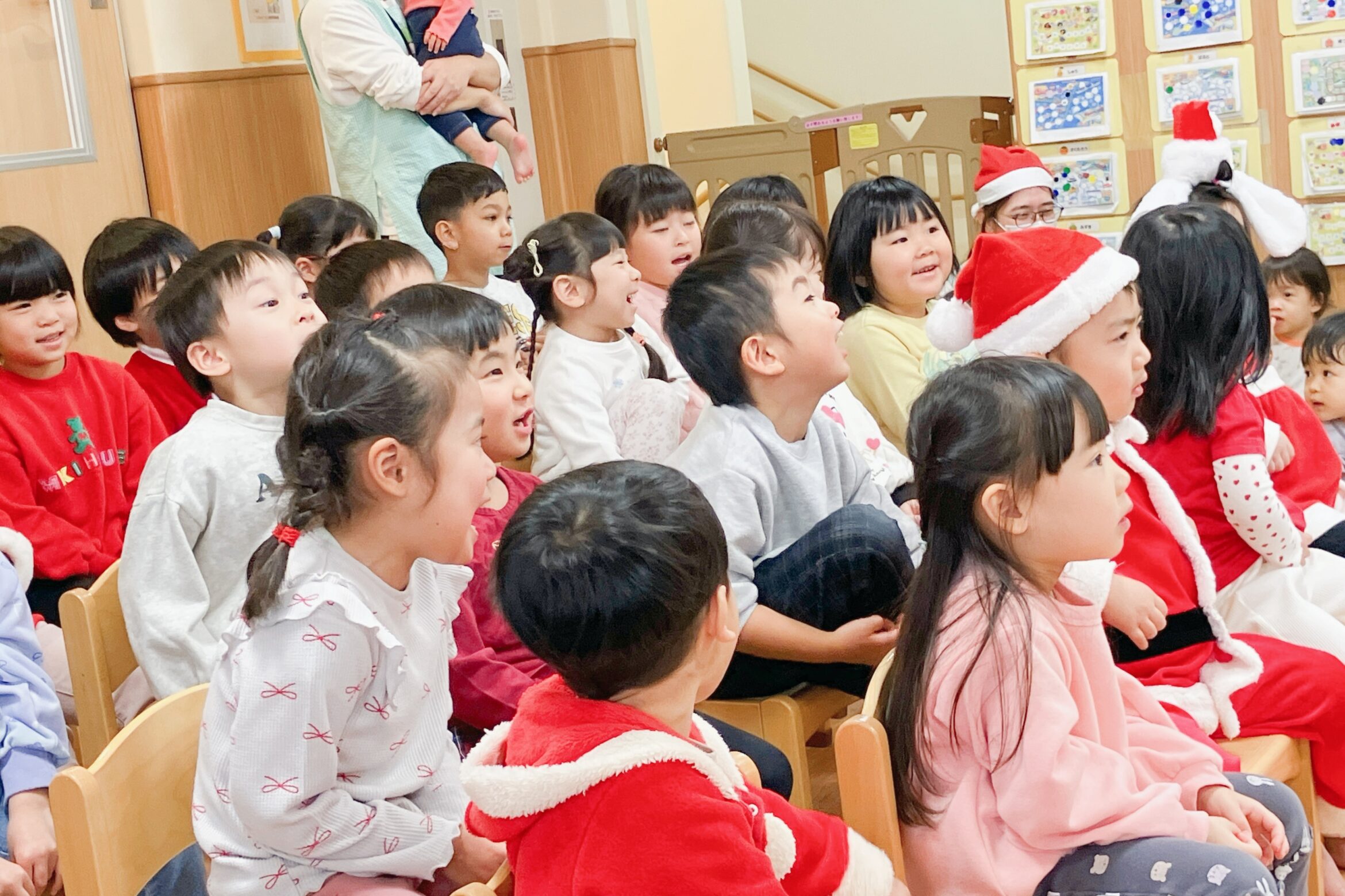 サンタさんを目の前にドキドキ・わくわくする子どもたち。