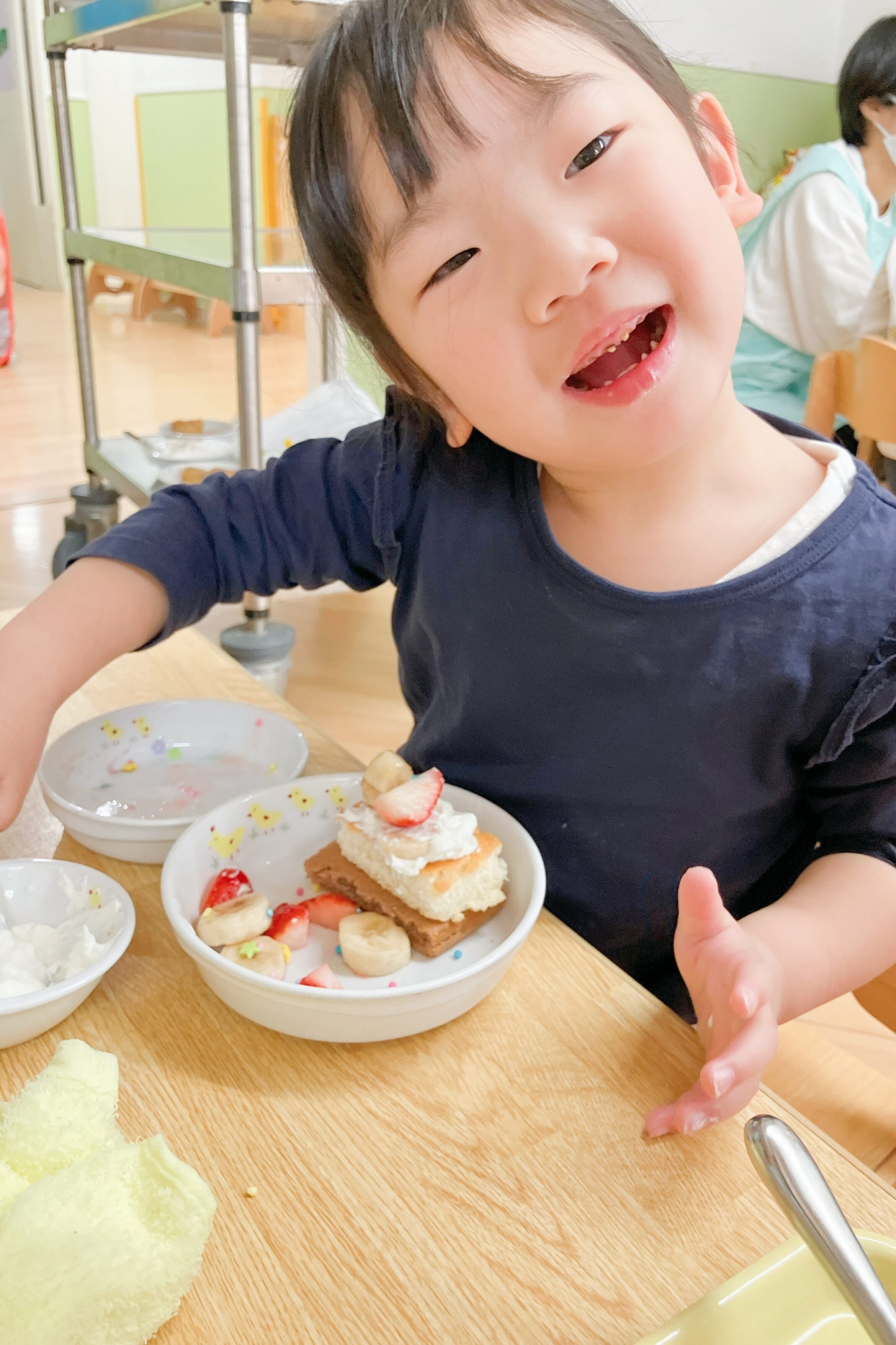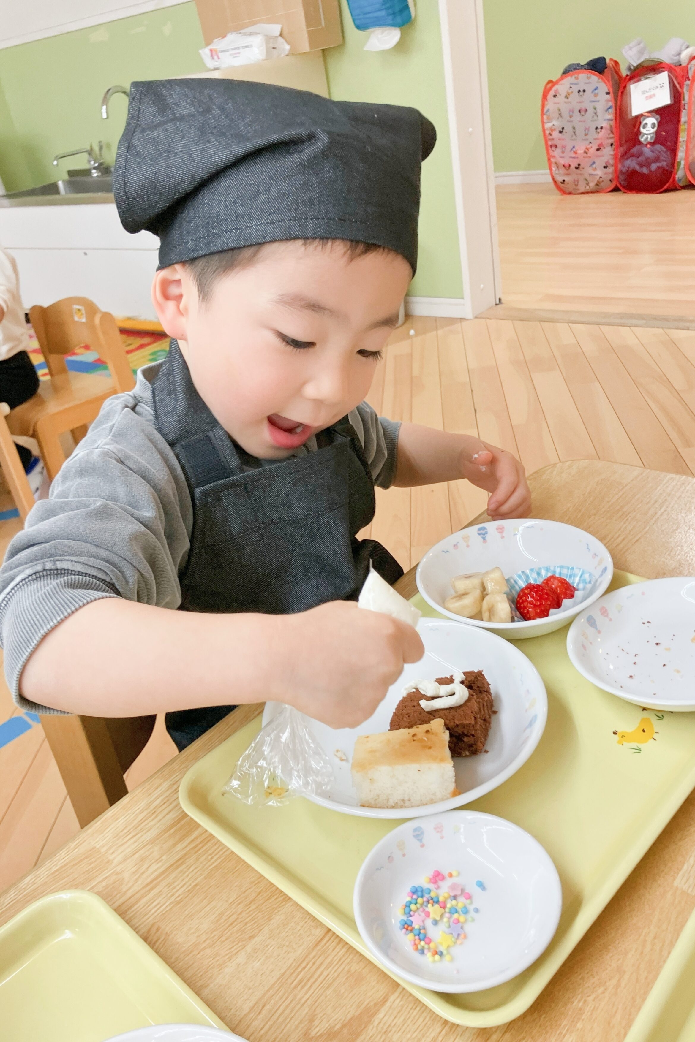 2歳児クラスはスプーンで生クリームをケーキに塗ったり、フルーツをケーキに飾りました✨