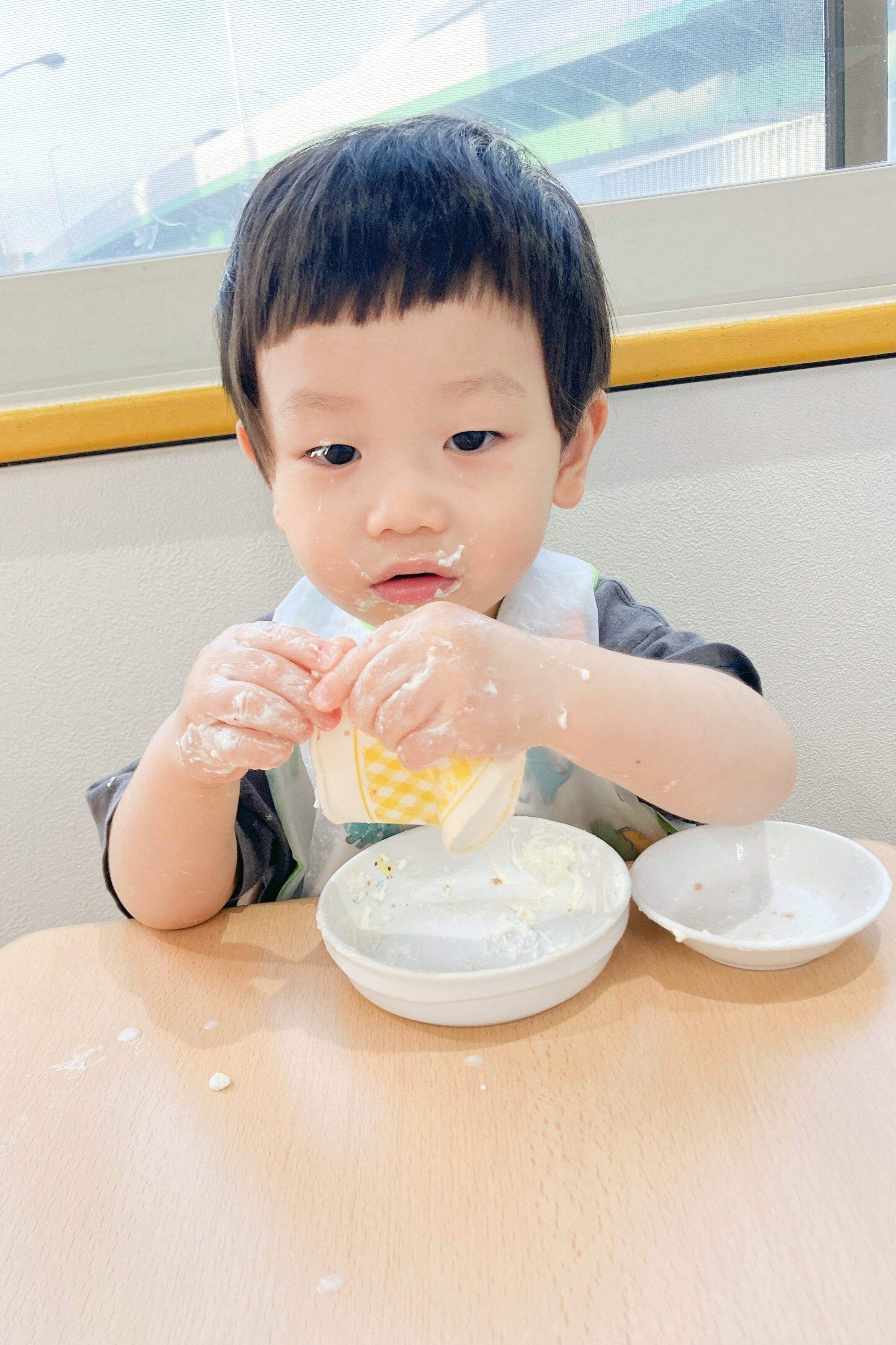 0歳児クラスはケーキの上に生クリームを絞ったり、フルーツを盛りつけました。食べ終わった後の姿がかわいいです♡