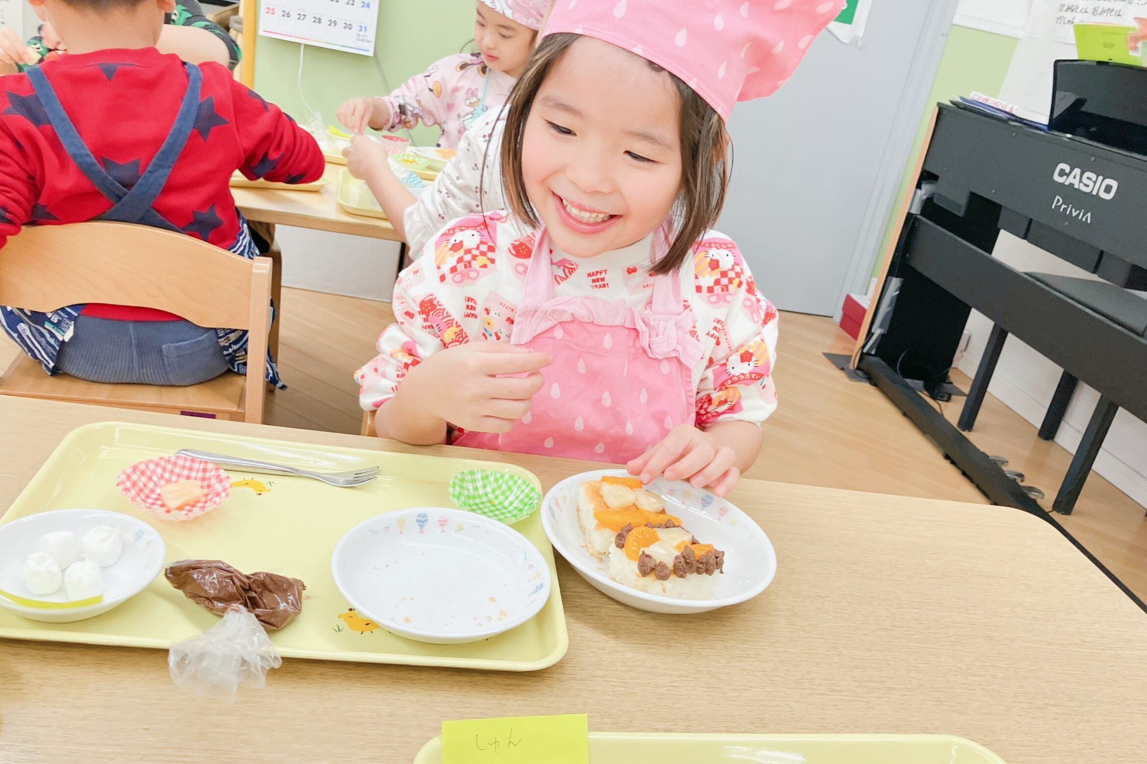 子どもたちに好きなケーキの味とフルーツを聞き、一人ずつ個別に対応して自分だけのケーキ作りを楽しみました。