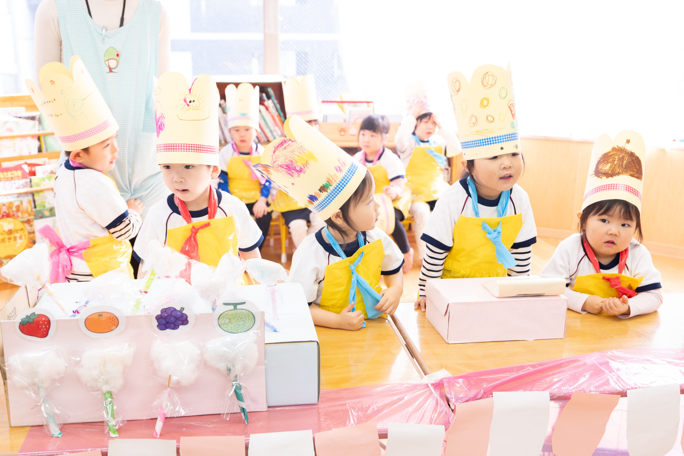 幼児クラスの子どもたちが、自分たちでどんなお店がいいか考え、商品を作り、お店屋さんを出店しました。