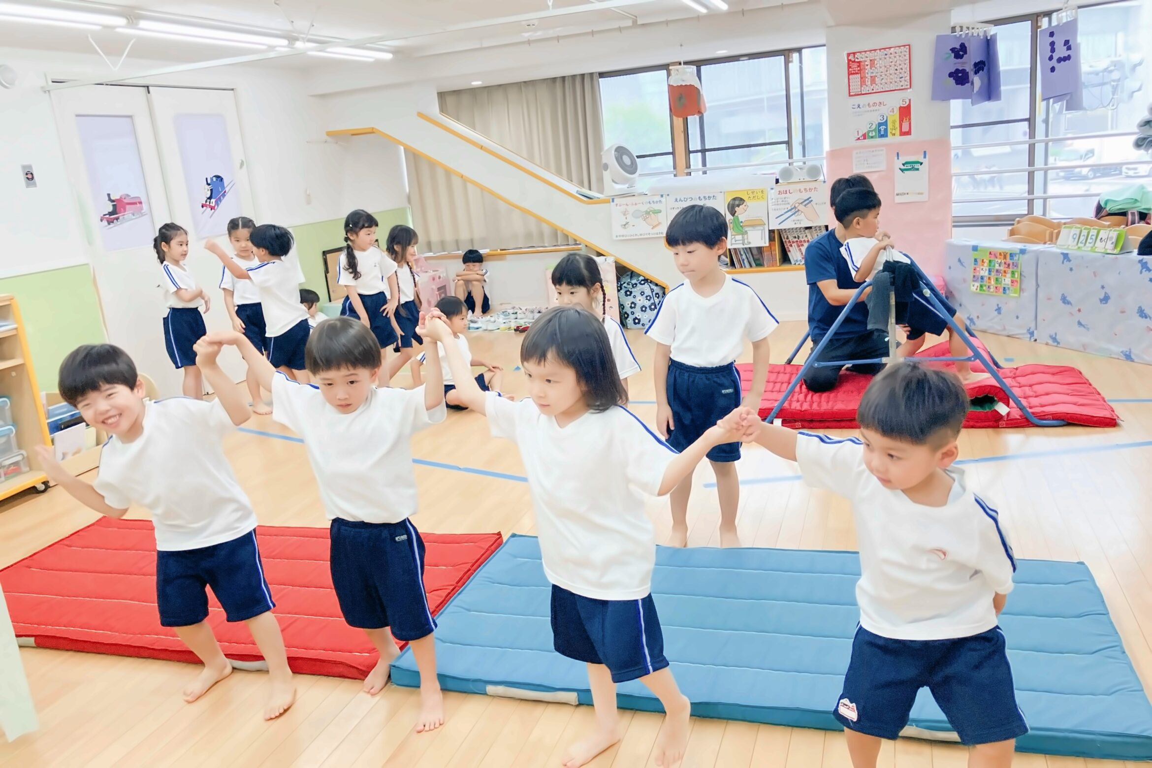 年中年長の子どもたちは体操教室が大好きです。体操服で張り切って登園していますよ。