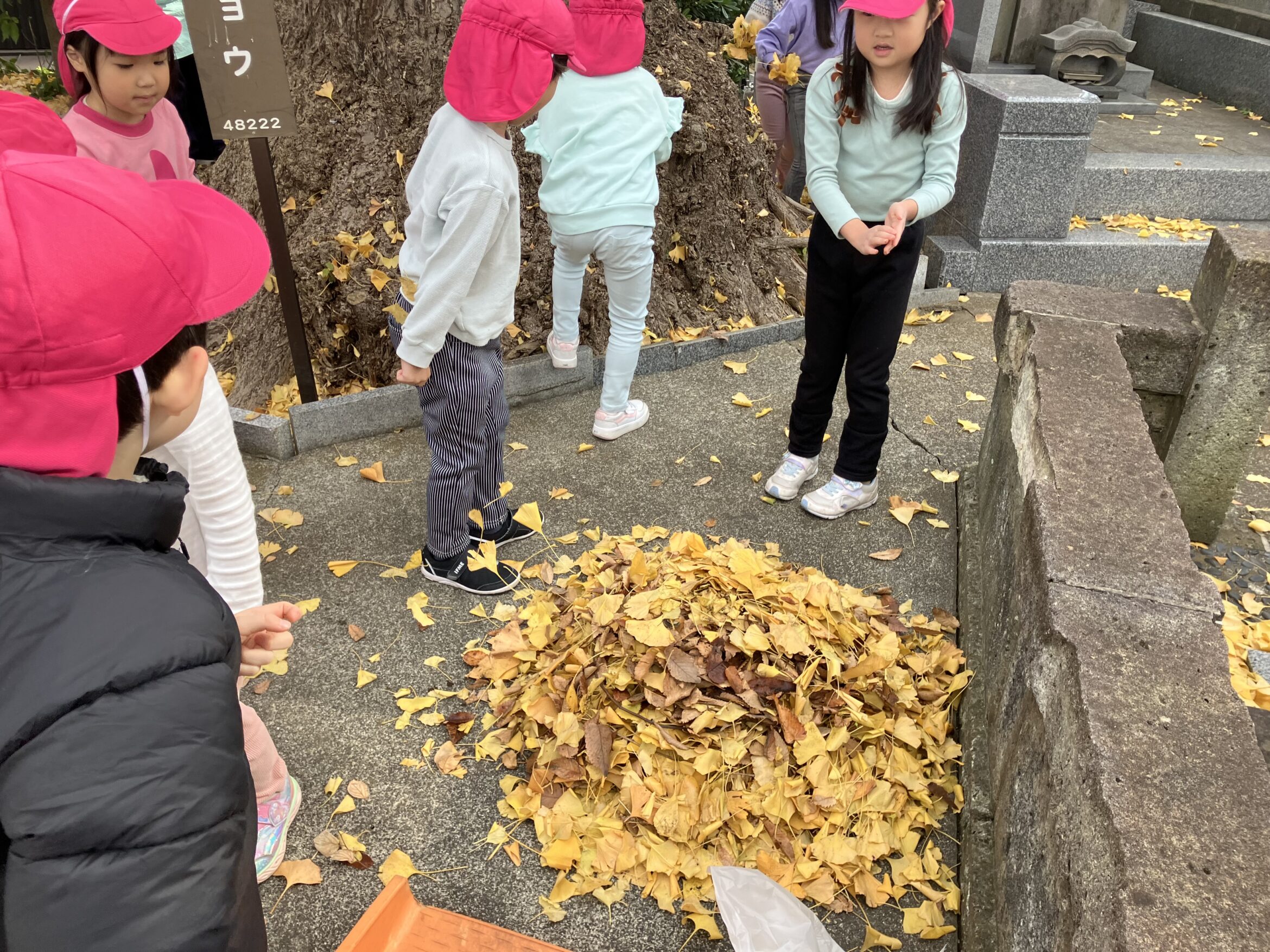 近所の善了寺さんに落ち葉拾いのお手伝いに行ったさくら組(5歳児)です。