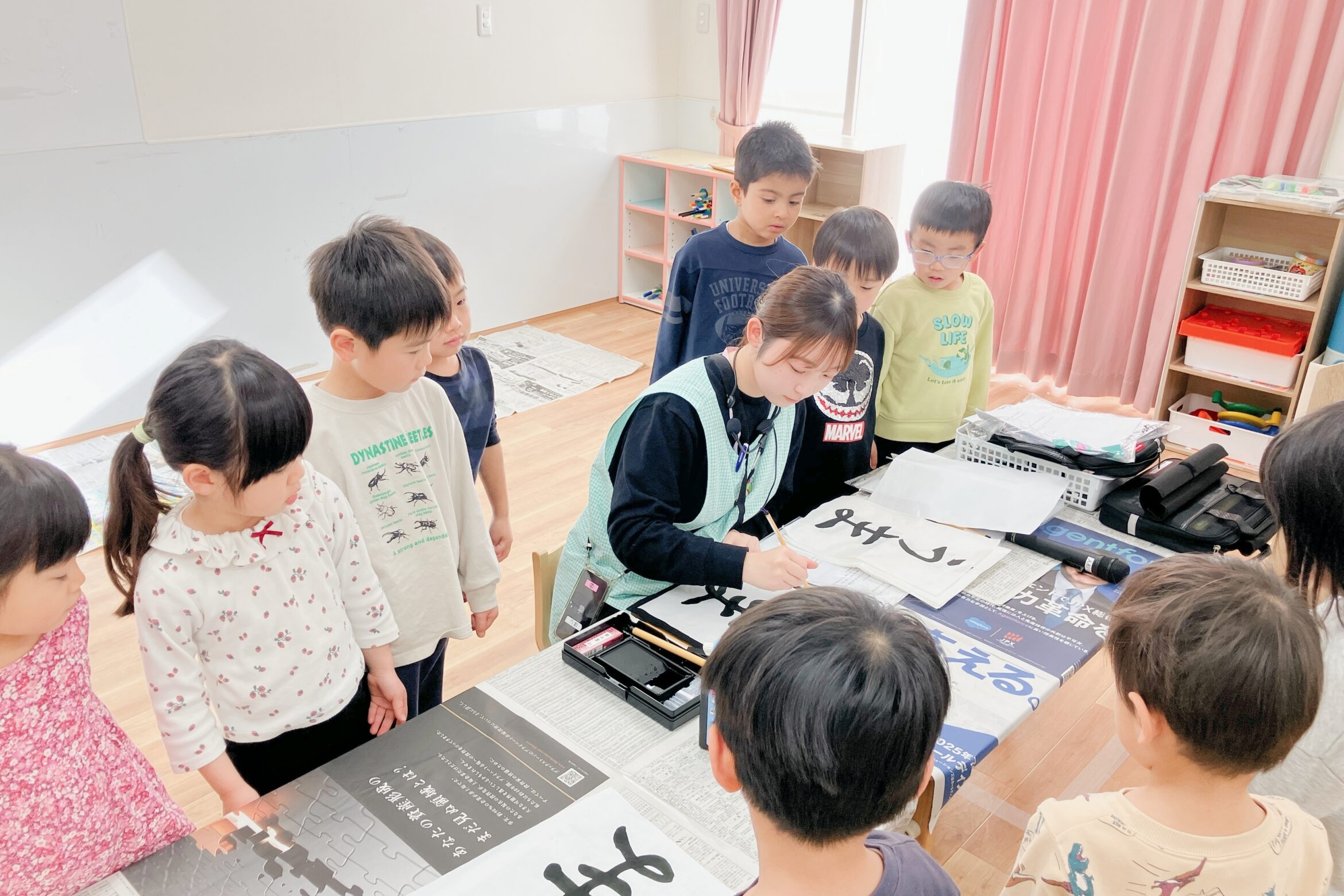 4歳児クラス、5歳児クラスでは書初めもおこないました。先生のお手本を真剣にじーっと見つめて、手の動きも見逃しません!