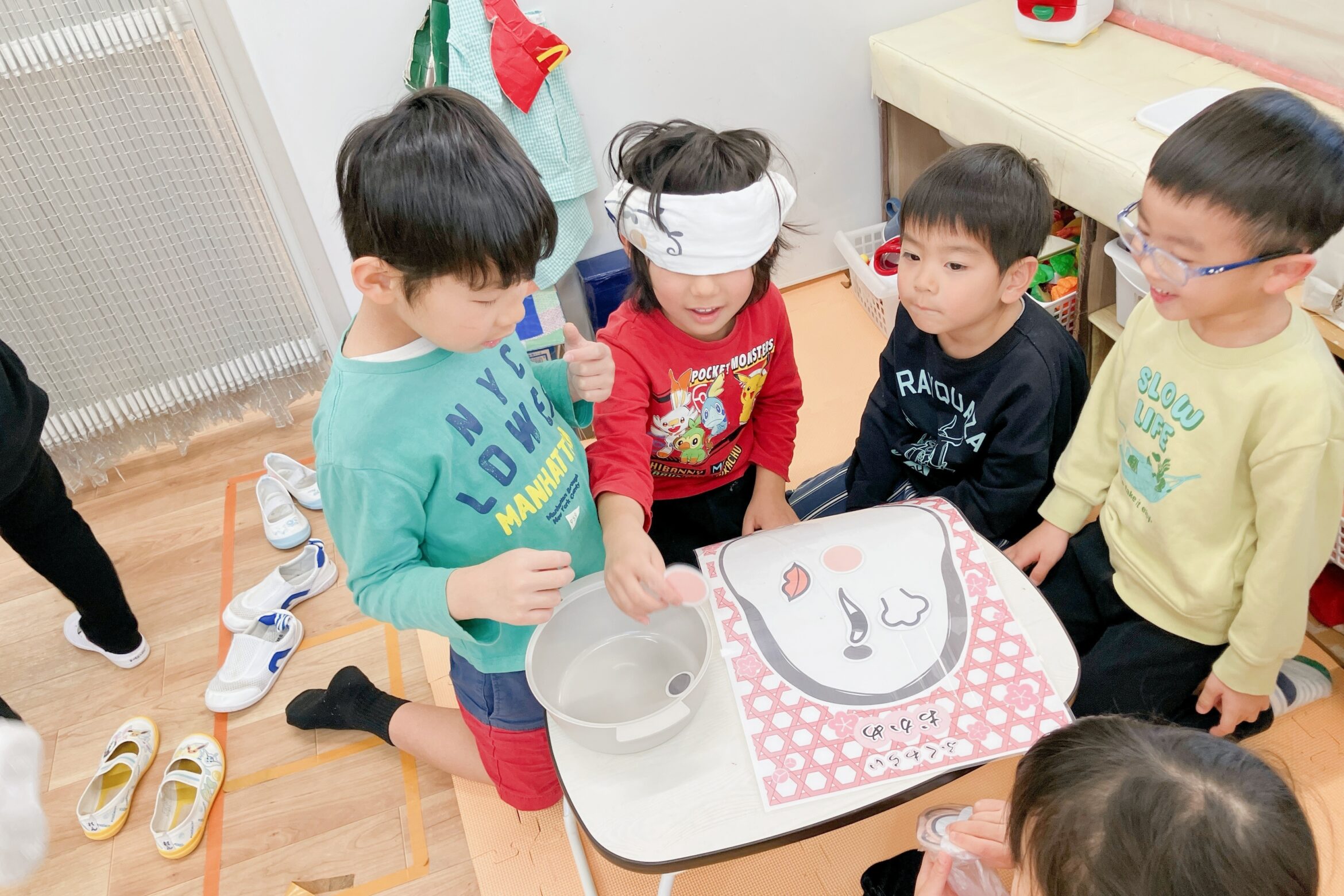 福笑い 周りのお友だちの声で「どっちにおこうかなぁ?!」「こっちだよ~」