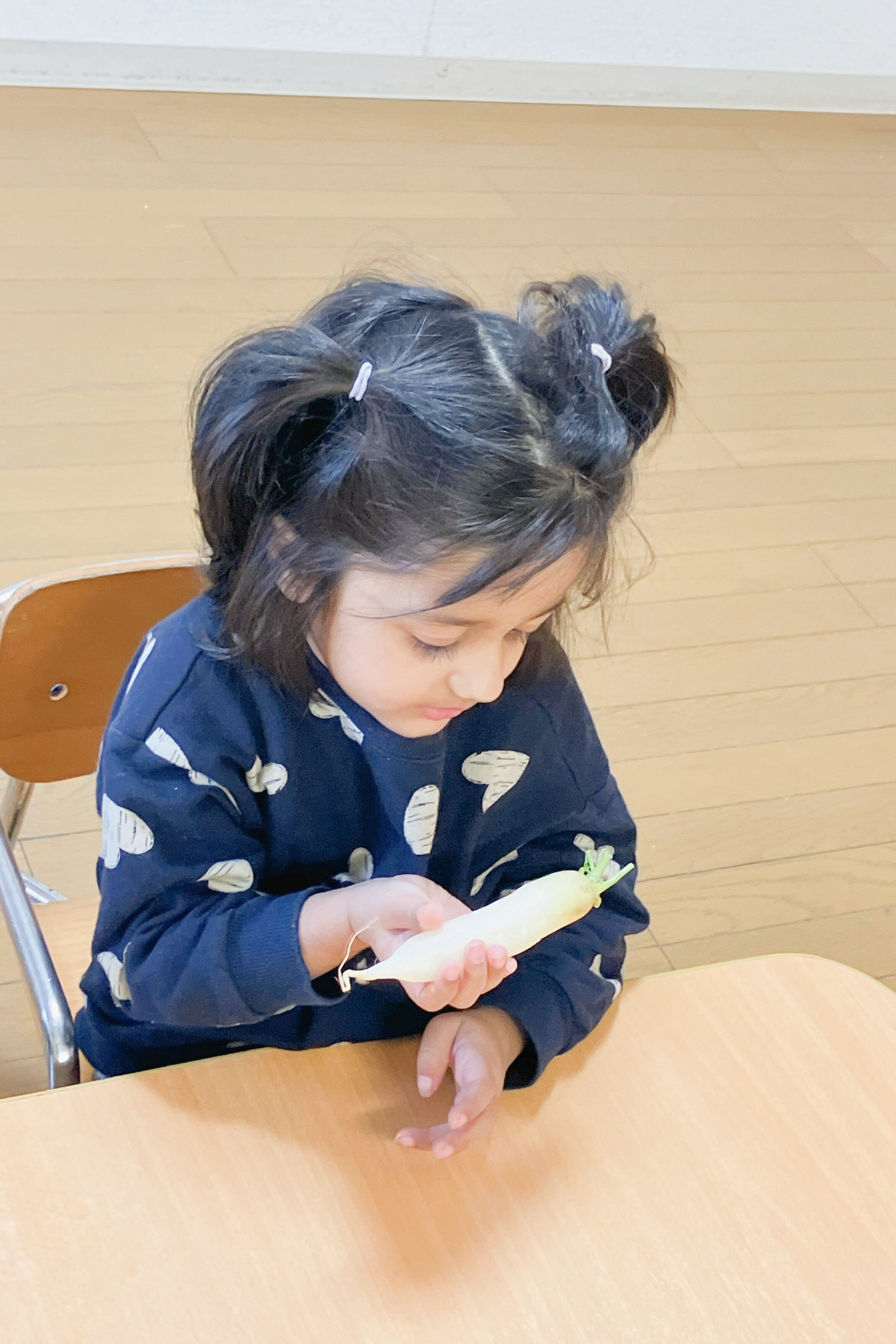 午後のおやつは七草粥。「これはすずしろ。だいこんのことだよ!」