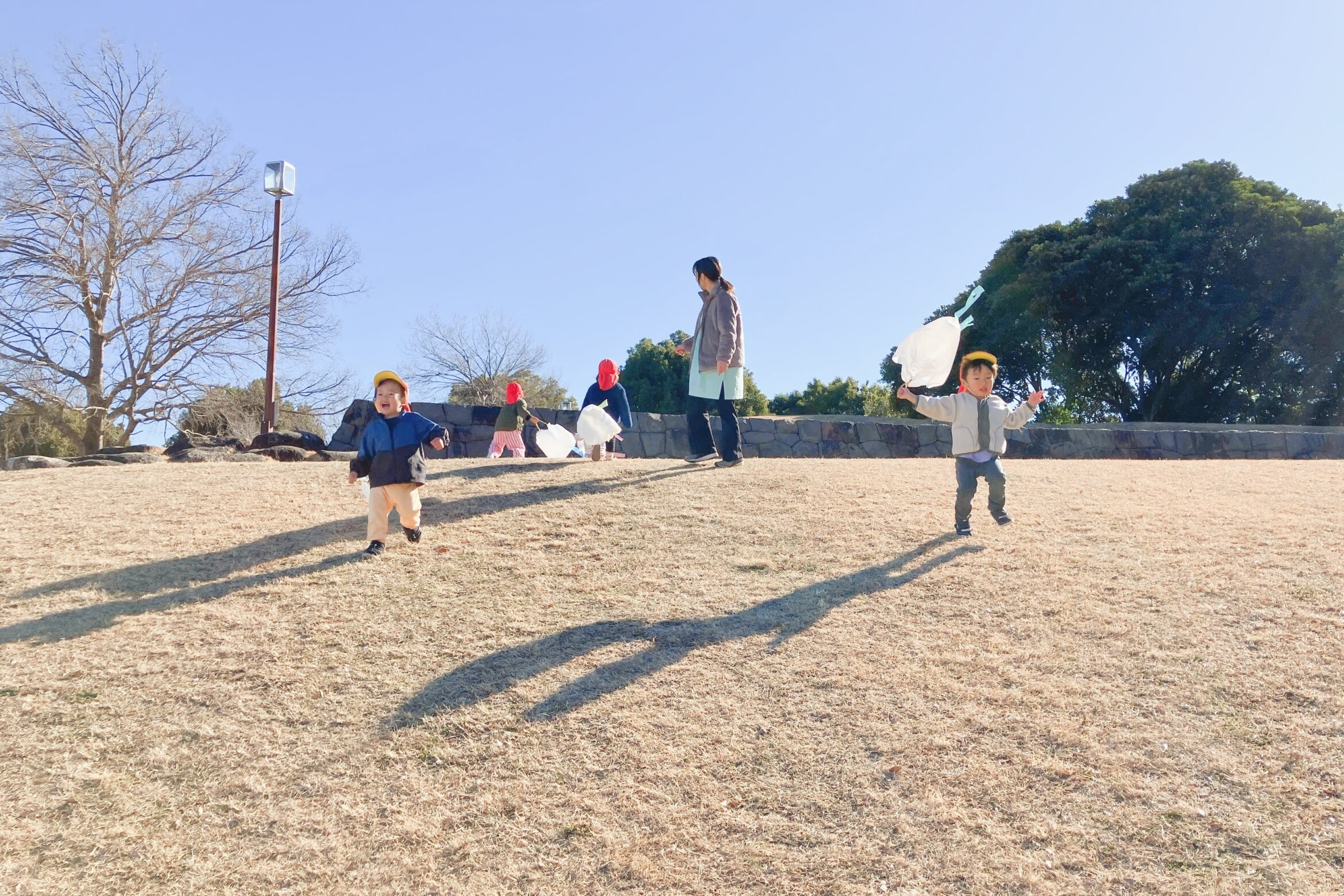 「みてみて、ぼくの凧!」と言いながら、たくさん走る子どもたち。風をうけて、ビニール凧が膨らむととってもうれしそうです♪