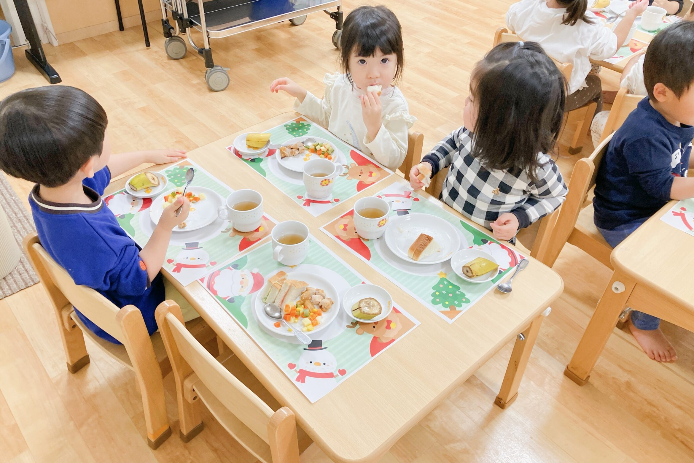 クリスマス仕様のランチョンマット、そらぐみさん制作のスノードームを飾って楽しい給食でした!