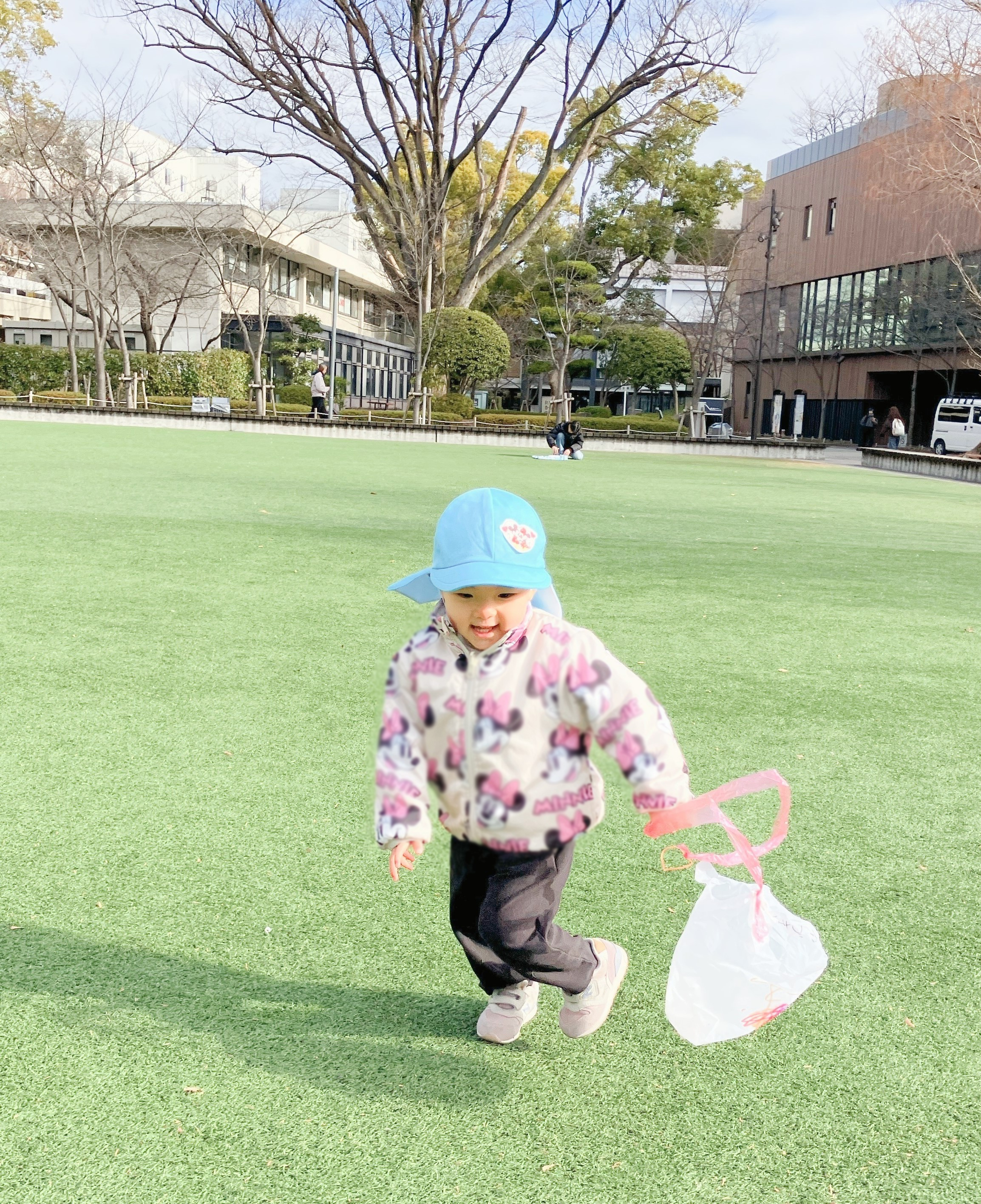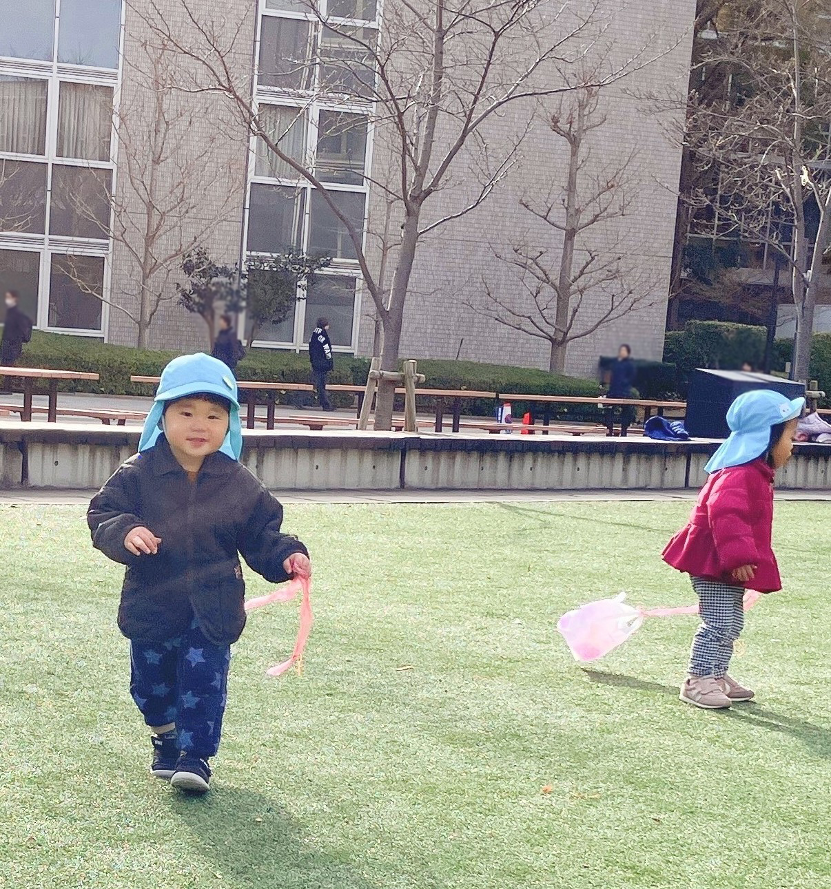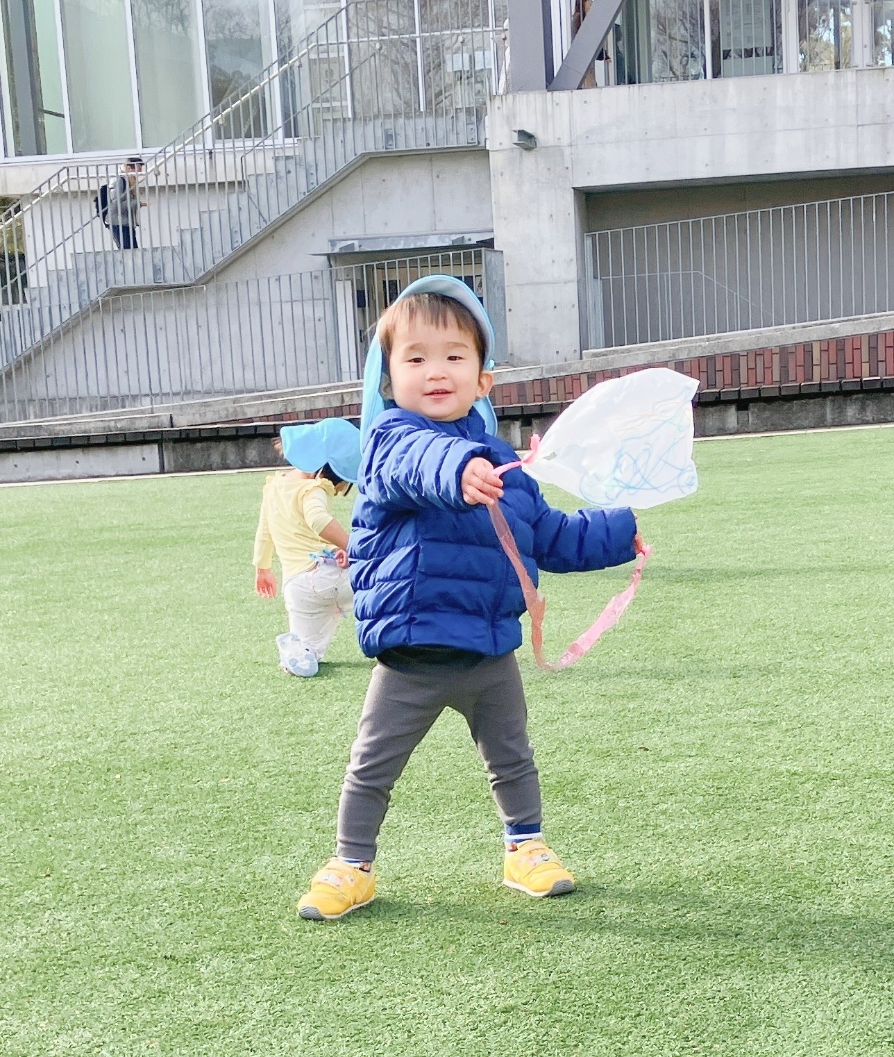 1歳児の子どもたちが自分たちでお絵描きをして完成させた凧を持って、お散歩に出発!