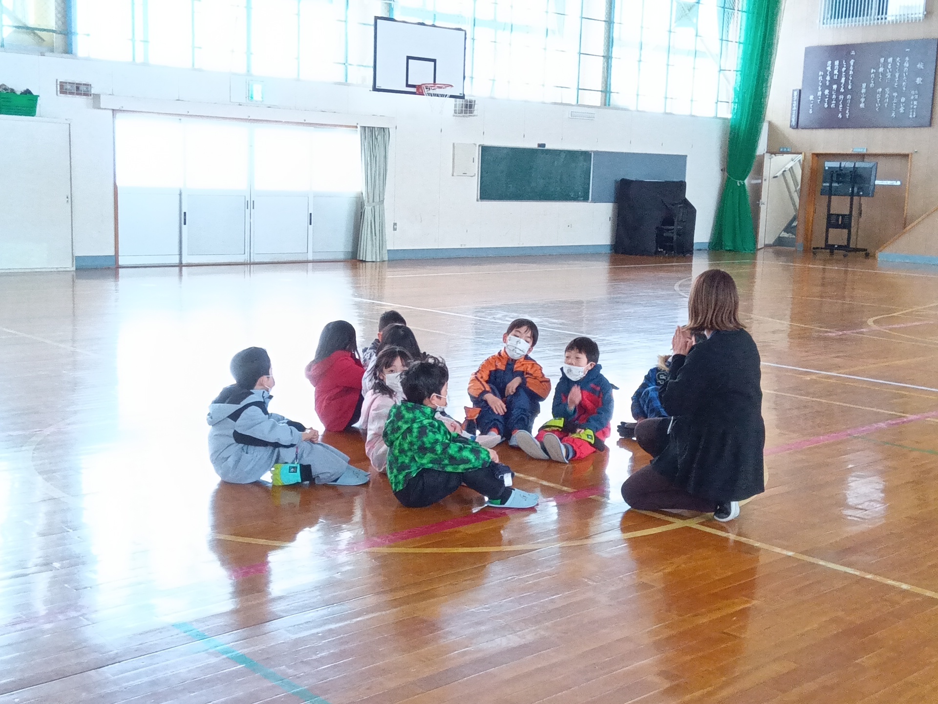 広い体育館の中を探検。保育園にないもので何を見つけたのかみんなで発表しました。