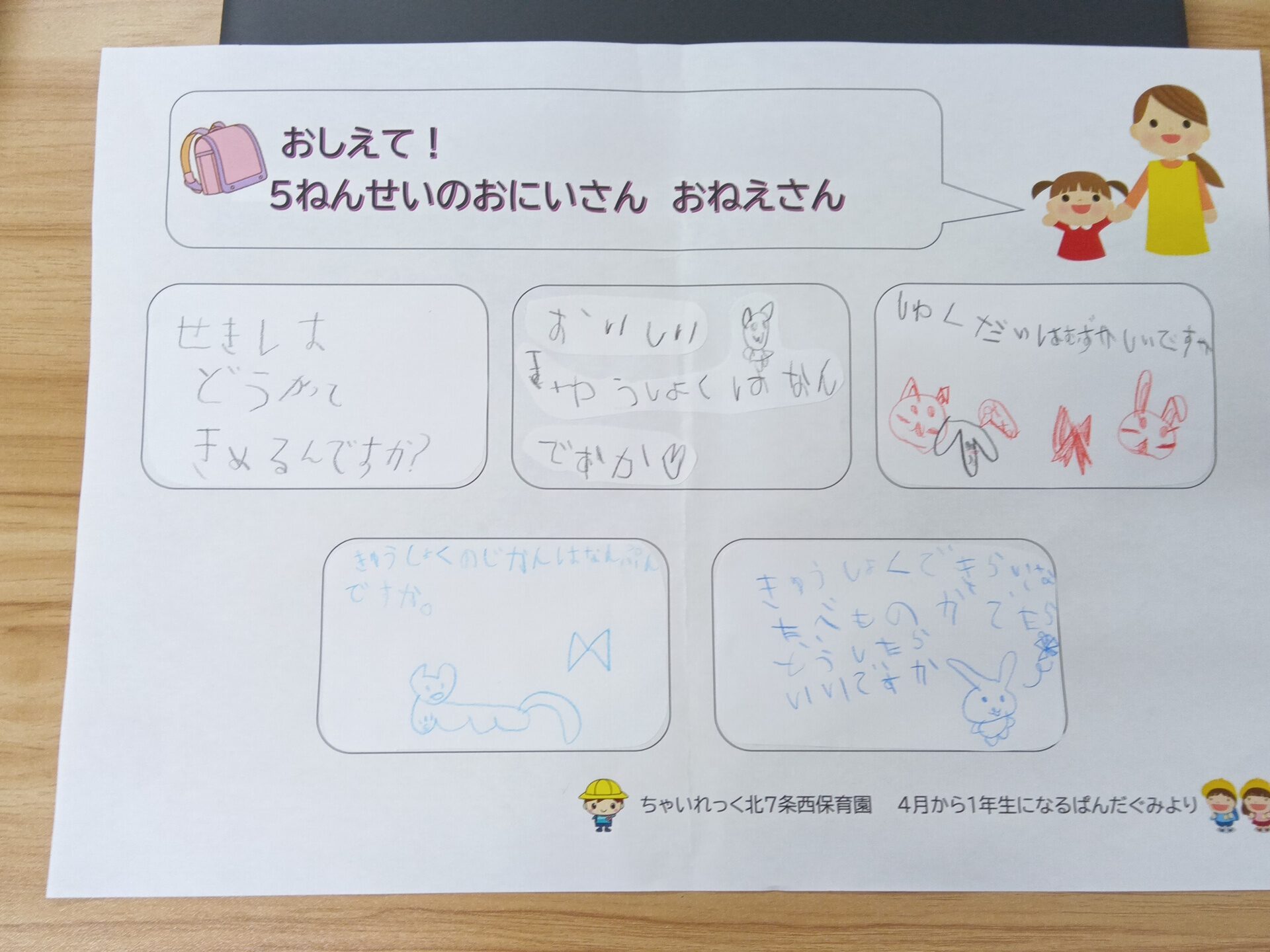 最後に、子どもたちから5年生のお兄さんお姉さんたちへの質問を書いたお手紙を先生に渡してきました。