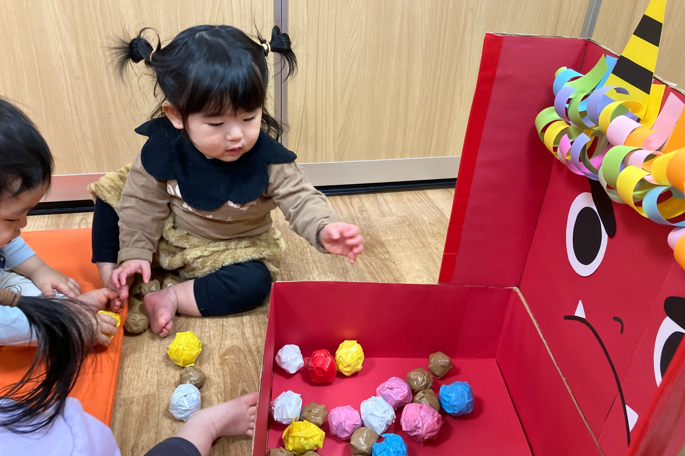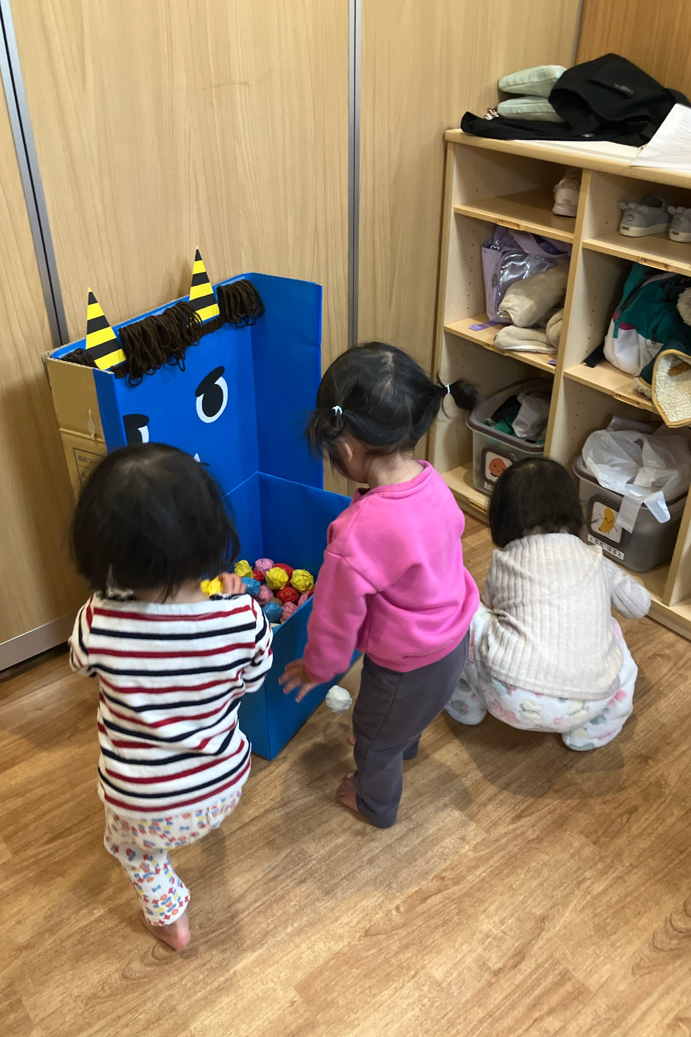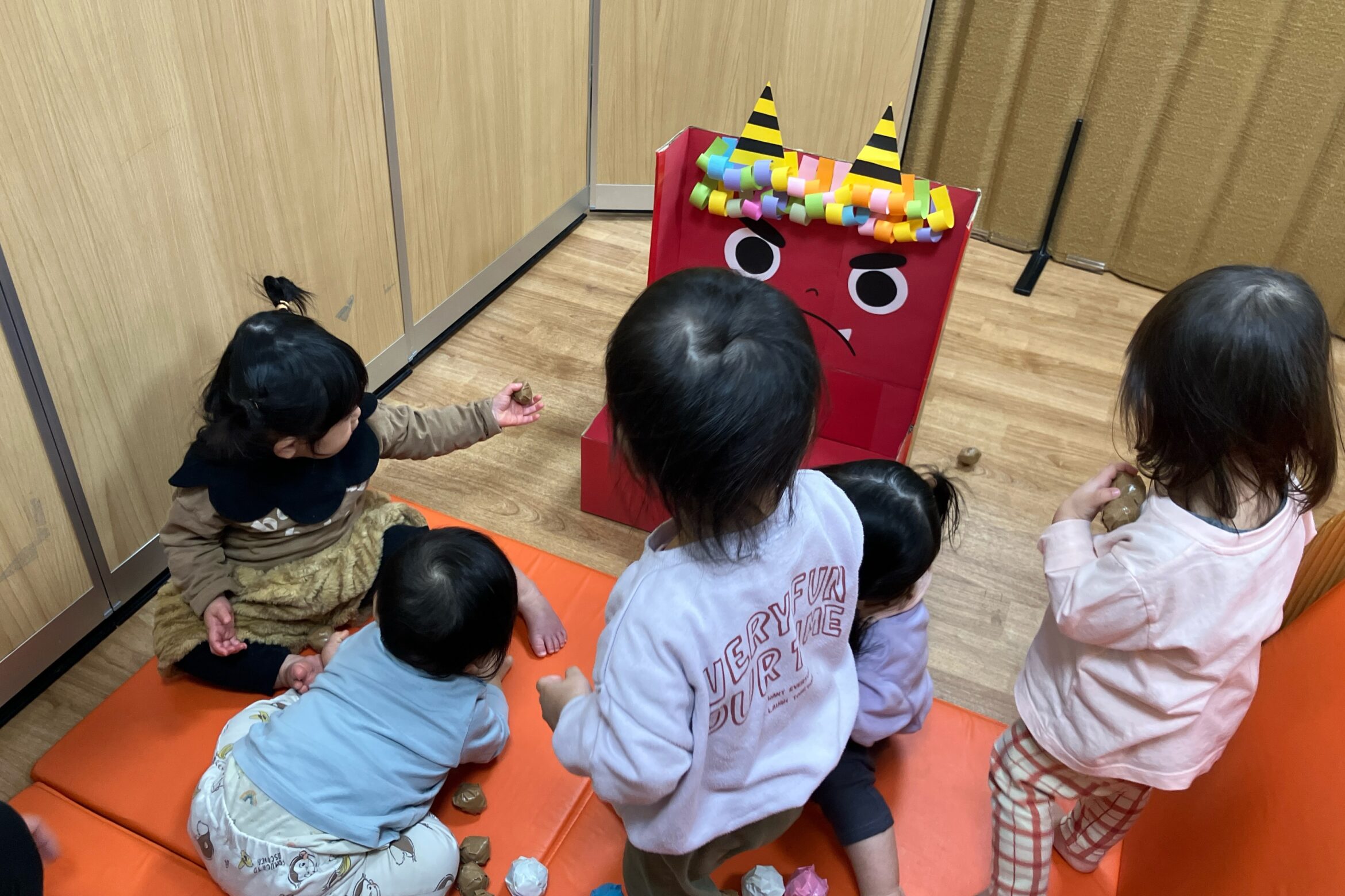 2026.02.09 上高田保育園 節分の日 節分行事の様子をご紹介します。 0歳児から5歳児まで楽しめるように、工夫して準備しました。 泣いた鬼、怒った鬼、笑った鬼 「鬼は~、外!」 「福は~、内!」 【1歳児】豆に見立てた小さいボールを青鬼に「エイッ!」 【0歳児】赤鬼に興味津々です 豆を出したり入れたりして、かわいいです。