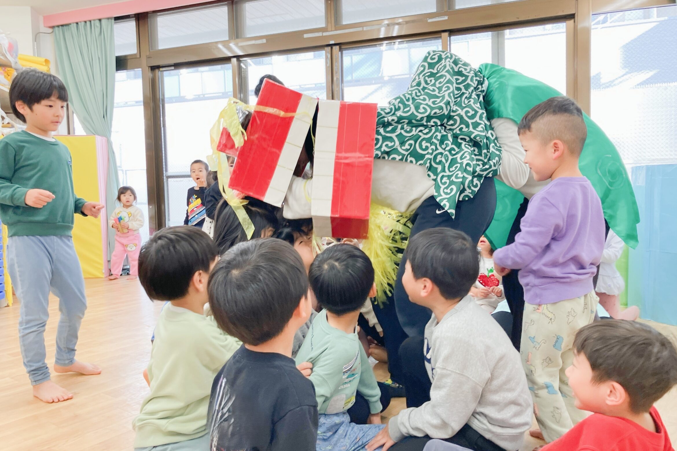 獅子舞の登場に、乳児クラスの中にはびっくりして泣いてしまう子もいましたが、幼児クラスの子どもたちは今年1年元気に過ごせることを祈って積極的に頭を噛んでもらいました♪