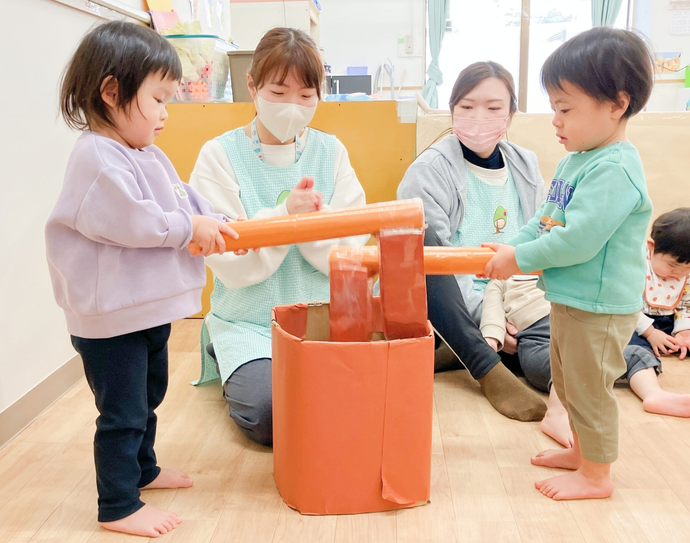 乳児さんは、ごっこ遊びとして手作りおもちゃでおもちつきをしました!「やりたいやりたい!」ととても楽しそうに参加していました✨